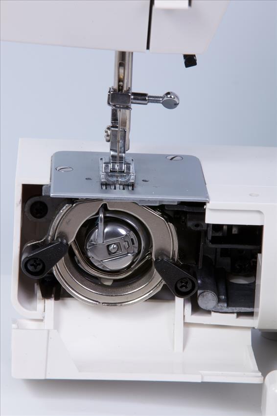 velký kryt volného ramene rozšiřující pracovní plochu a zvyšující pohodlí při šití zejména náročných materiálů, s vnitřní velkou schránkou na příslušenství
