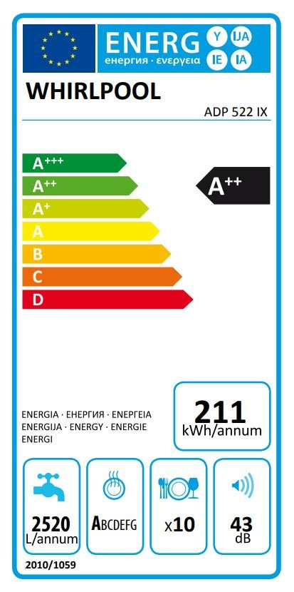 Volně stojící myčka Whirlpool ADP 522 IX v energetické třídě A++ . Má 8 programu mytí a pojme až 10 sad nádobí. Zaujme nejen elegantním nerezovým designem, ale i senzorovou technologií 6. smysl.
