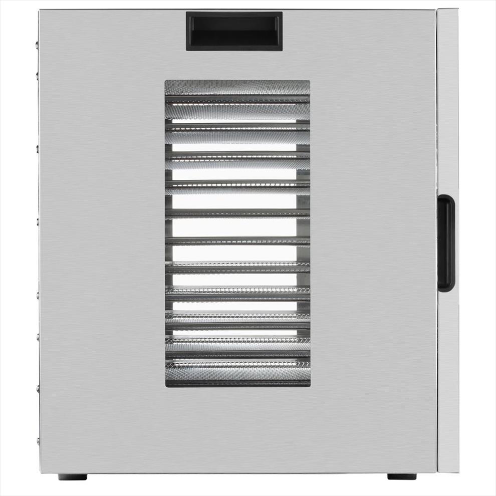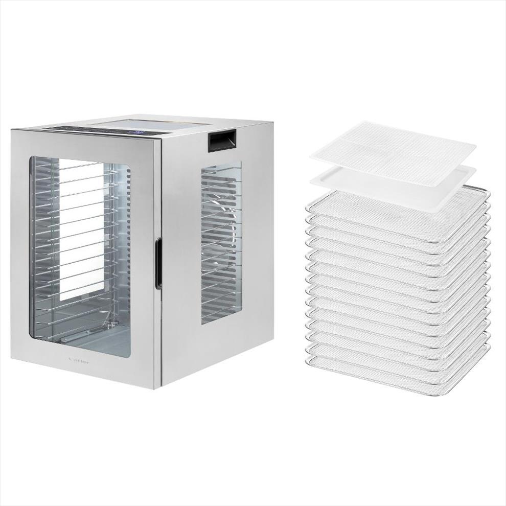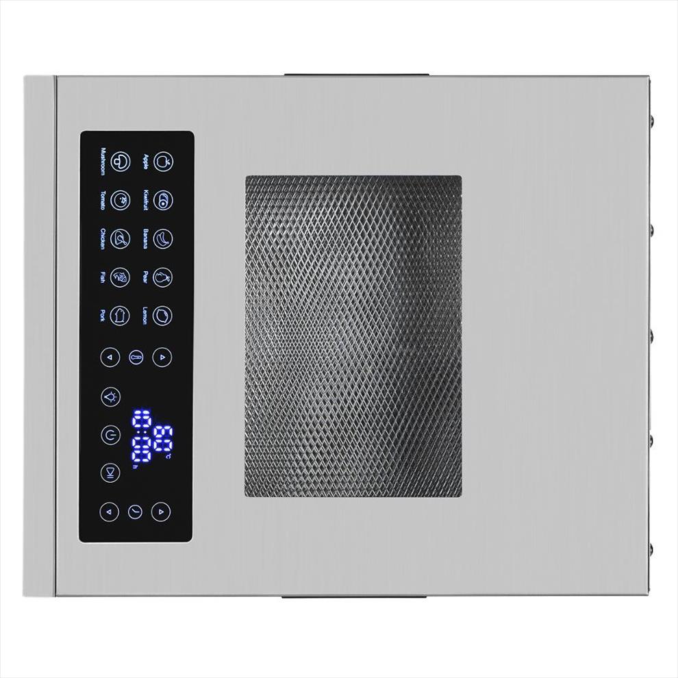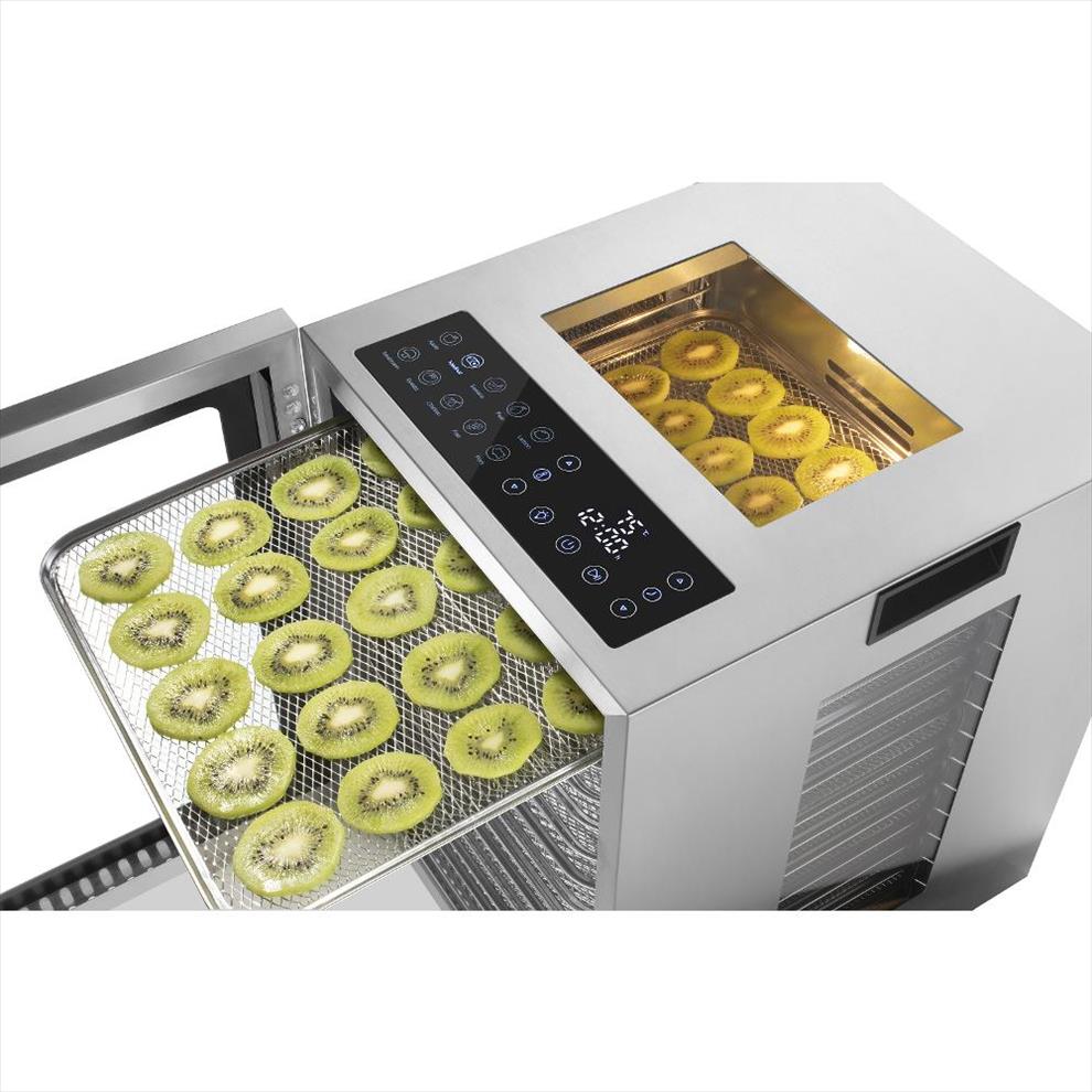 Sušička potravin, 14 nerezových sušicích plat, teplotní rozsah 35–75 °C, nastavitelný čas sušení 1–48 hodin, 10 automatických programů pro různé druhy potravin, vnitřní světlo pro kontrolu procesu