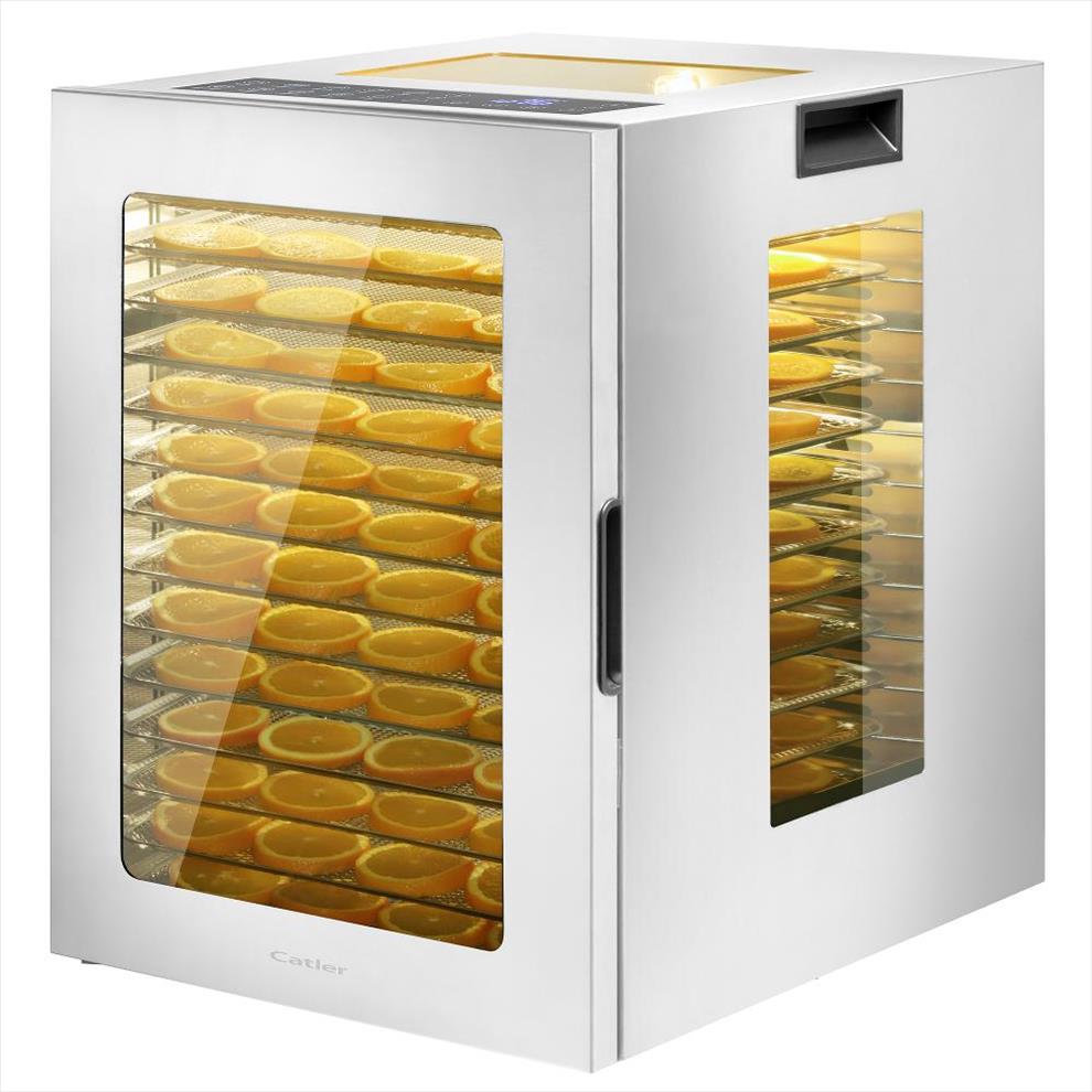 Sušička potravin FD 4012 od značky Catler představuje vrchol profesionální kvality v oblasti domácího zpracování surovin. Její elegantní nerezové tělo bez jediného plastového dílu zaručuje nejen prémiový vzhled, ale především maximální hygienickou čistotu i spolehlivý provoz na dlouhá léta. Precizní design je vidět v každém detailu – od snadno vysunovatelných sušicích plat až po panoramatické skleněné stěny, které vám umožní sledovat celý proces ze všech úhlů. Intuitivní dotykové ovládání spolu s praktickým vnitřním osvětlením vytvoří z každého použití příjemný zážitek.