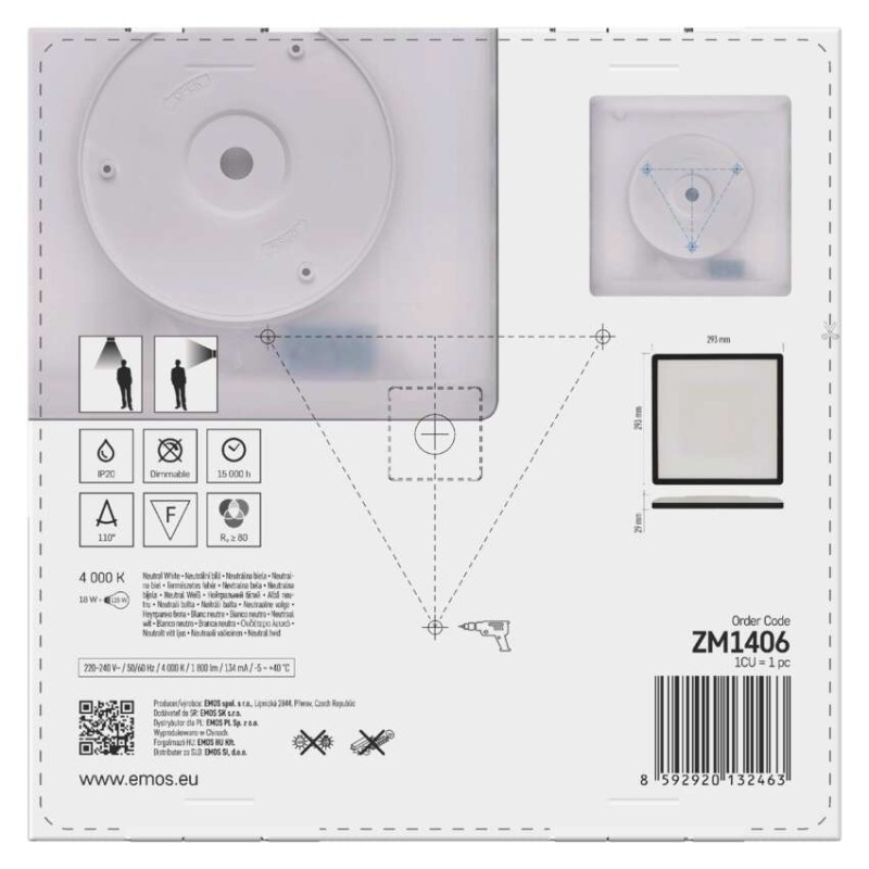 barva světla: neutrální bílá|barva těla: černá|dálkový ovladač: ne|do chodby a na schodiště: ano|do dílny a garáže: ne|do kanceláře: ne|do koupelny: ne|do kuchyně: ano|do obýváku, ložnice a dětského pokoje: ano|dosah senzoru: neuvádí se|flicker-free: neuvádí se|frekvence: 50/60 Hz|index podání barev (CRI): Ra > 80|kategorie: ESSENTIAL|krytí: IP20|materiál difuzoru: plast|materiál LGP: neuvádí se|materiál těla: plast|montážní otvor: neuvádí se|možnost stmívání: ne|náhrada za žárovku: 115 W|napětí: 220–240 V~|na zahradu a balkon: ne|pohybový senzor: ne|příkon: 18 W|prodejní obal: 1 ks, krabice|proud: 134 mA|řada: FLORI|rozměr: 293 × 293 × 29 mm|světelná účinnost: 100 lm/W|světelný tok: 1 800 lm|teplota chromatičnosti: 4 000 K|tvar: čtverec|typ difuzoru: mléčný|typ svítidla: klasické svítidlo|účiník: > 0,5|UGR<: neuvádí se|úhel vyzařování: 110°|umístění: stropní/nástěnné|výstupní proud ze zdroje: neuvádí se|záruční doba: 2 roky|zdroj světla: LED|životnost: 15 000 hodin|způsob montáže: p