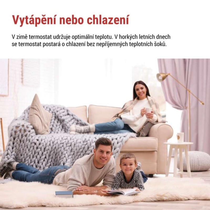 barva: bílá|délka kapilárového čidla: –|dosah ve volném prostoru: –|druh regulace: vytápěcí a chladící systém|funkce ON/OFF: ano|funkce prázdniny: ano|funkce Set-back: ne|jazyky aplikace: –|kalibrace teploty: ano|kompatibilita: –|měření teploty: 0 °C až 40 °C, rozlišení 0,1 °C|možnost propojení s dalšími detektory: ne|napájení: 2× 1,5 V AA (součástí dodávky)|napájení brány: –|napájení přijímače: –|napájení vysílače: –|nastavení teploty: 7 °C až 30 °C, po 0,2 °C|nastavitelný rozptyl teploty: 0,1 °C, 0,2 °C, 0,5 °C, 1,0 °C|notifikace do mobilní aplikace: ne|ochrana proti zamrznutí: ano|ovládání hlasovými asistenty: ne|počet programů: 6 + 3 uživatelsky nastavitelné|podlahové čidlo: –|podporované OS: –|podsvícený displej: ano|pracovní frekvence: –|přenosová frekvence: –|prodejní obal: 1 ks, krabička|protokol: –|rozměr: –|rozměr brány: –|rozměr přijímače: –|rozměr vysílače: 98 × 31 × 98 mm|součást balení: neuvádí se|spínaná zátěž: 8 A odporově, 2 A induktivně|spínání: 230 V AC nebo beznap