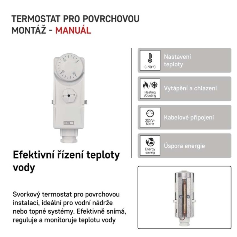 Příložný termostat pro povrchovou montáž. Snímá teplotu vody v zásobnících teplé užitkové vody a nebo v topných systémech. Umožňuje regulaci teploty, hlídání teplotních omezení a funkci poklesu teploty.