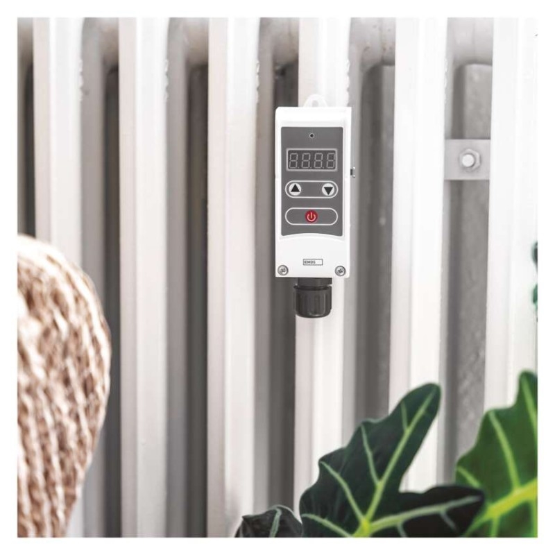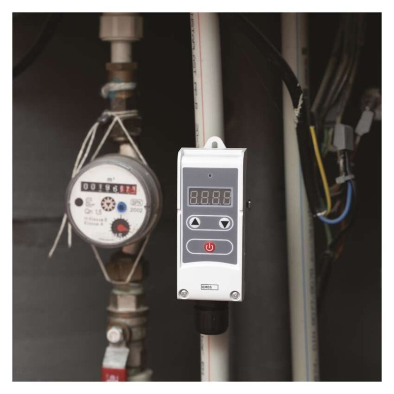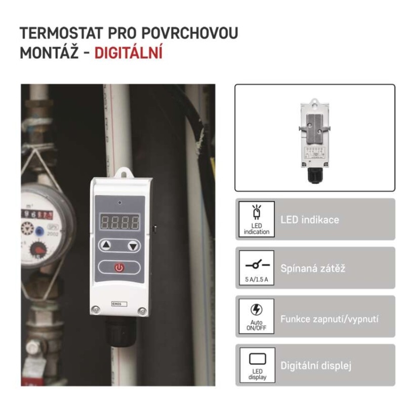 Příložný termostat pro povrchovou montáž. Snímá teplotu vody v zásobnících teplé užitkové vody a nebo v topných systémech. Umožňuje regulaci teploty, hlídání teplotních omezení a funkci poklesu teploty.