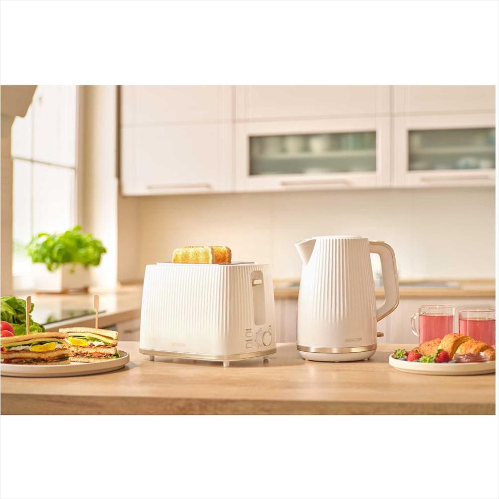 O perfektní snídani se postará snídaňový set moderních spotřebičů – 2 topinkovačů a konvice. Spotřebiče spolu dokonale ladí a díky svému jednotnému stylu se budou skvěle vyjímat na vaší kuchyňské lince.