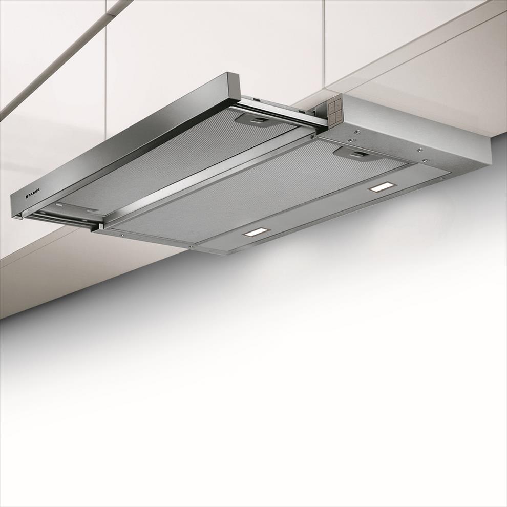 Odsavač disponuje aktivní výsuvnou částí, která po vysunutí sepne digestoř v přednastaveném režimu. Zasunutím lišty se funkce automaticky deaktivují.