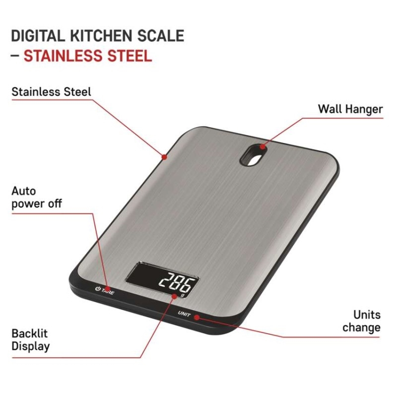 Maximální zátěž až 10 kg, podsvícený displej, dotyková tlačítka s rychlou odezvou, otvor pro zavěšení, nerezový povrch.
