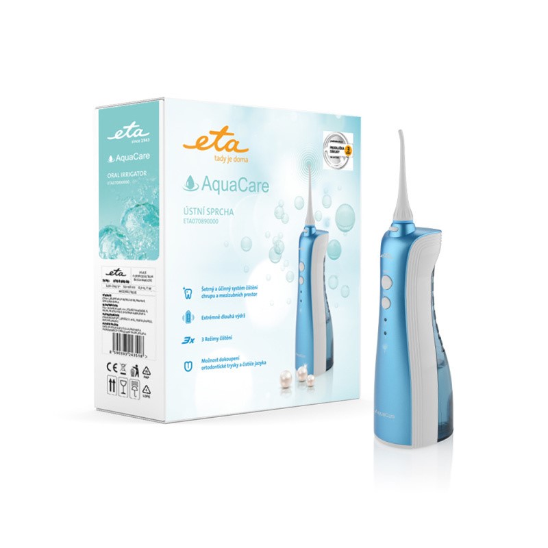 Typ: Orální centrum: NE Úložný prostor: ANO Ústní sprcha: ANO Zdroj energie: aku (Li-ion) Časovač: ANO SMART: NE Bělení: NE Cestovní pouzdro: NE Objem nádržky (na vodu) (ml): 150 Tlak vody (bar): 6.2 Tlakový senzor: NE Značka kvality dTest: NE Provedení výrobku: modrá barva Účinné čištění mezizubních prostor Velmi sofistikovaný šetrný a účinný systém čištění chrupu a mezizubních prostor pomocí ultrajemného průtoku vody (vodní paprsek 0,6 mm). Pokud vám zubní kartáček nestačí a nejste zrovna přeborníci v čištění zubů zubní nití, pak je právě ústní sprcha ETA070890000 Aquacare tím nejlepším řešením. Díky proudu vody odstraňuje zubní plak, nečistoty a bakterie z mezizubního prostoru a zpod dásní. Ústní sprcha je tedy inovativním pomocníkem v oblasti dentální hygieny. Objem nádrže je 150 ml, přičemž její konstrukce zaručuje snadné vyjímání, plnění a čištění. Provozní tlak čerpadla v závislosti na nastaveném režimu se pohybuje v rozsahu 2,7-6,2 bar (40-90 PSI). Univerzální napětí 100-240 V umožňuje vzít spotřebič s sebou na dovolenou nebo služební cestu. Celá konstrukce sprchy je postavena na jednoduchosti – vyměnit a nasadit příslušenství zvládne kdokoli. Jak často se používá? Sprcha je uzpůsobena pro každodenní ústní hygienu jako doplněk k čištění zubů. Je vhodná pro čištění implantátů, fixních rovnátek, můstků i korunek. Snadné ovládání a použitelnost Ústní sprchu Aquacare lehce zapnete a vypnete spínačem ON/OFF. Světelná signalizace upozorňuje na změny – tedy vybití, proces nabíjení, úplné nabití a na zvolený režim čištění. Ústní sprcha Aquacare má tři režimy čištění – Normal - pro běžné čištění zdravých zubů a dásní, Soft - šetrný režim pro citlivé zuby a dásně, a Pulse - pro šetrné masírování dásní. Díky ergonomické rukojeti vám ústní sprcha skvěle padne do ruky a s možností otáčet trysku o celých 360° je snadné nalézt optimální polohu pro čistění jak levou, tak i pravou rukou. Ústní sprcha Aquacare je vybavena kvalitním akumulátorem Li-ion, který vydrží na jedno nabití až 50 minut. Doba nabíjení trvá 18 hodin. Ideální je nechat ústní sprchu dobíjet přes noc prostřednictvím napájecího kabelu o délce 1,2 metru. Bezpečností opatření Aby nedošlo k poškození sprchy, disponuje automatickým vypnutím po 2 minutách chodu. Konstrukce má krytí IPX7, která chrání sprchu i v případě náhodného ponoření do vody. Stojan je vybaven integrovaným úložným prostorem pro hygienické odkládání trysek. Součástí balení je praktický nabíjecí stojan s náhradními ústními tryskami (2 kusy). Velkou výhodou je možnost dokoupit další speciální nástavce jako volitelné příslušenství (ortodontická tryska pod objednacím číslem ETA 270790200, nástavec na čištění jazyka pod objednacím číslem ETA 270790300). ETA na tento výrobek poskytuje prodlouženou záruku 3 roky na baterii. Prodlouženou záruku si registrujte ZDE . Ústní sprcha * Šetrný a účinný systém čištění chrupu a mezizubních prostor * Díky silnému proudu vody odstraňuje zubní plak, nečistoty a bakterie z mezizubního prostoru a zpod dásní * Ideální pro každodenní ústní hygienu jako doplněk čištění zubů, pro čištění implantátů, fixních rovnátek, můstků a korunek * Otočné čisticí hlavice o 360° * Ultrajemný průtok vody (vodní paprsek 0,6 mm) * Provozní tlak čerpadla: 2,7 - 6,2 bar (40 - 90 PSI) * Nádržka na vodu o objemu 150 ml – její konstrukce zaručuje snadné vyjímání, plnění a čištění * 3 režimy čištění (Normal, Soft, Pulse) * Bezpečnostní funkce automatického vypnutí po 2 minutách * ON / OFF spínač * Světelná signalizace (vybití, nabíjení, nabití a funkce) * Ergonomicky tvarovaná rukojeť * Velmi kvalitní Li-ion akumulátor * Doba nabíjení 18 hodin * Výdrž akumulátoru až 50 minut * Snadné nasazování a výměna příslušenství * Univerzální napětí (100 - 240 V) * Krytí IPX7 (chráněno proti ponoření do vody) * Délka napájecího kabelu 1,2 m * Integrovaný úložný prostor pro hygienické umístění trysek * Součástí balení je praktický nabijecí stojan a náhradní ústní trysky 2 ks * Prodloužená záruka 3 roky DOKOUPITELNÉ PŘÍSLUŠENSTVÍ * Náhradní tryska, 2 ks (ETA270790100) * Náhradní ortodontická tryska, 2 ks (ETA270790200) * Náhradní nástavec na čištění jazyka, 2 ks (ETA270790300) Rozměry výrobku: Hmotnost (kg): 0.470 Výška (cm): 30.50 Šířka (cm): 11.00 Hloubka (cm): 10.00 Rozměry balení: Hmotnost (kg): 0.750 Výška (cm): 23.50 Šířka (cm): 20.00 Hloubka (cm): 7.50 EAN: 8590393243518 Záruční doba: 24 měsíců Ústní sprcha ETA Aquacare s 3 režimy čištění - Normal, Soft a Pulse, provozní tlak 2,7-6,2 bar.