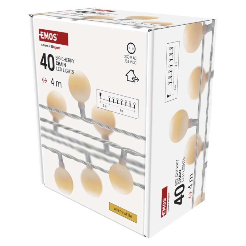 Řetězy CHERRY – s velkými kuličkami nabízejí širokou škálu použití nejen při tvorbě vánoční výzdoby a atmosféry. Jejich LED světýlka jsou schovaná v kuličkách o průměru 2,5 cm, které jsou ozdobou i ve chvílích, kdy řetěz nesvítí. Na základě zvolené délky a barvy světla se postarají o ozdobení malých dekorací v interiéru, rozsvícení vánočního stromečku i většího stromu na zahradě. Skvěle se hodí pro vytvoření slavnostní atmosféry na rodinné oslavě, svatbě nebo dětské párty. Všude tam mohou během dne bílé kuličky vypnutého řetězu CHERRY sloužit jako dekorace, která se po setmění rozzáří a navodí tu pravou atmosféru. Řetězy CHERRY jsou tak doslova dva v jednom.