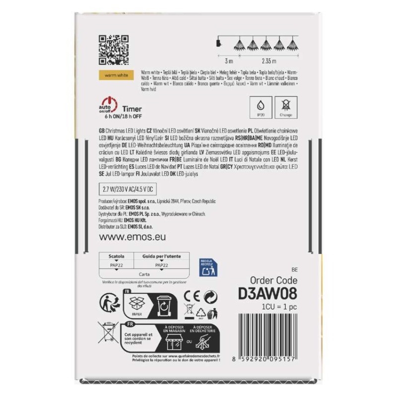 Tento typ řetězu je určen výhradně pro vnitřní použití (IP20) a disponuje funkcí časovače, který je integrovaný přímo do napájecího zdroje. Při jeho aktivaci se řetěz rozsvítí na 6 hodin, poté zhasne a po 18 h se rozsvítí znovu. Vybírat můžete z více barev provedení napájecího kabelu, počtu LED, délek i barev světla.