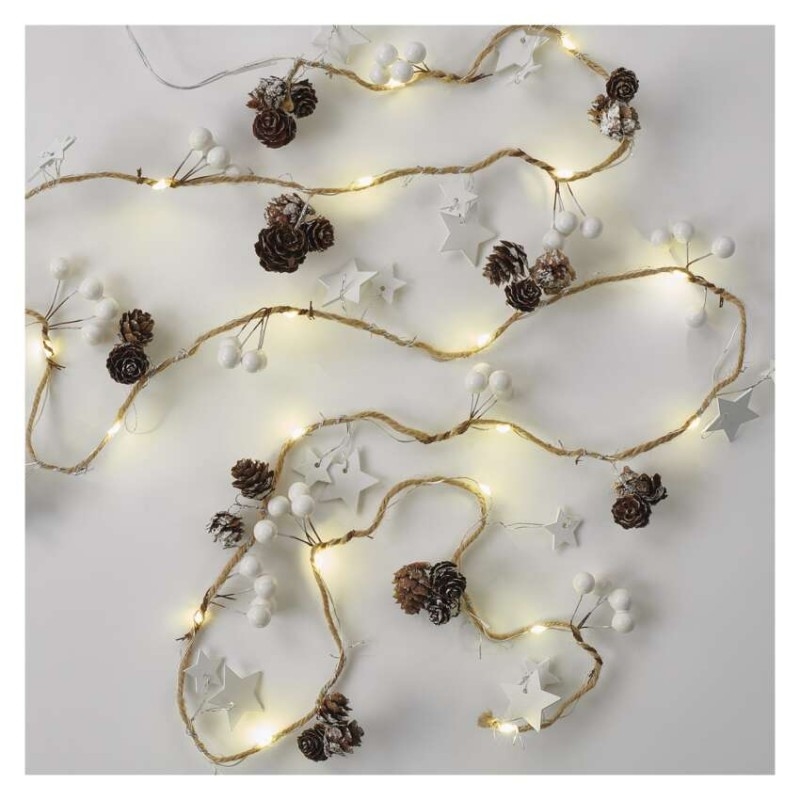 Chcete vánočně vyzdobit okna, zábradlí, slavnostně prostřený stůl nebo rozzářit vázy, adventní svícny a věnce? Pak právě pro vás máme vánoční svítící girlandu s šiškami, která je napájena AA bateriemi a hodí se do každého interiéru. Oceníte ji zejména v případech, kdy není žádoucí, aby byl celkový dojem z dekorace rušen přívodním kabelem nebo není dostupný zdroj elektrické energie. Své uplatnění nachází i při výzdobě dětských pokojíčků, kde odpadá starost o vaše nejdražší při manipulaci s klasickými zásuvkami. Díky napájení tužkovými bateriemi pro ni není žádný problém ani výzdoba stanu, obytného vozu či karavanu při pobytu v přírodě.