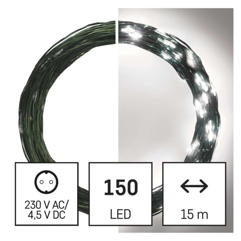 barva drátu: zelená|barva světla: studená bílá|časovač: ano|dálkový ovladač: ne|délka přívodu: 5 m|funkce: svítí|krytí: IP44|LED mezera: 10 cm|materiál: kov|možnost propojení: ne|počet LED: 150|použití: venkovní i vnitřní|příkon: 2,7 W|prodejní obal: 1 ks, krabice|produkt: nano řetěz|pro výšku stromu: 170 cm|rozměr: 15 m|tvar: nano|typ napájení: síťový adaptér|velikost LED: 3 mm (nano)|vstupní napětí: 230 V AC|výstupní napětí: 4,5 V DC|záruční doba: 2 roky|životnost: 10 000 hodin