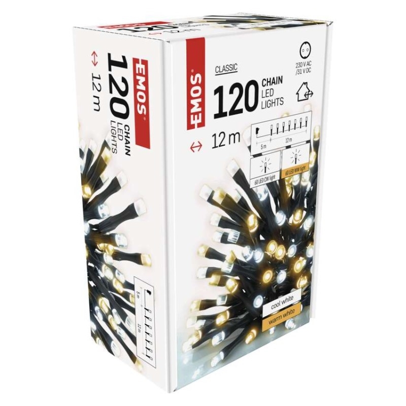 EMOS LED vánoční řetěz, 12 m, venkovní i vnitřní, teplá/studená bílá, časovač