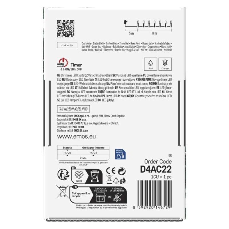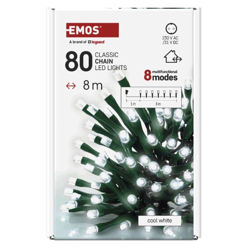 EMOS LED vánoční řetěz, 8 m, venkovní i vnitřní, studená bílá, programy, časovač