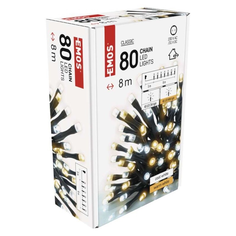 EMOS LED vánoční řetěz, 8 m, venkovní i vnitřní, teplá/studená bílá, časovač