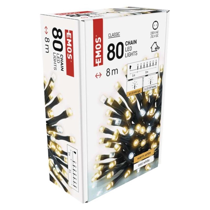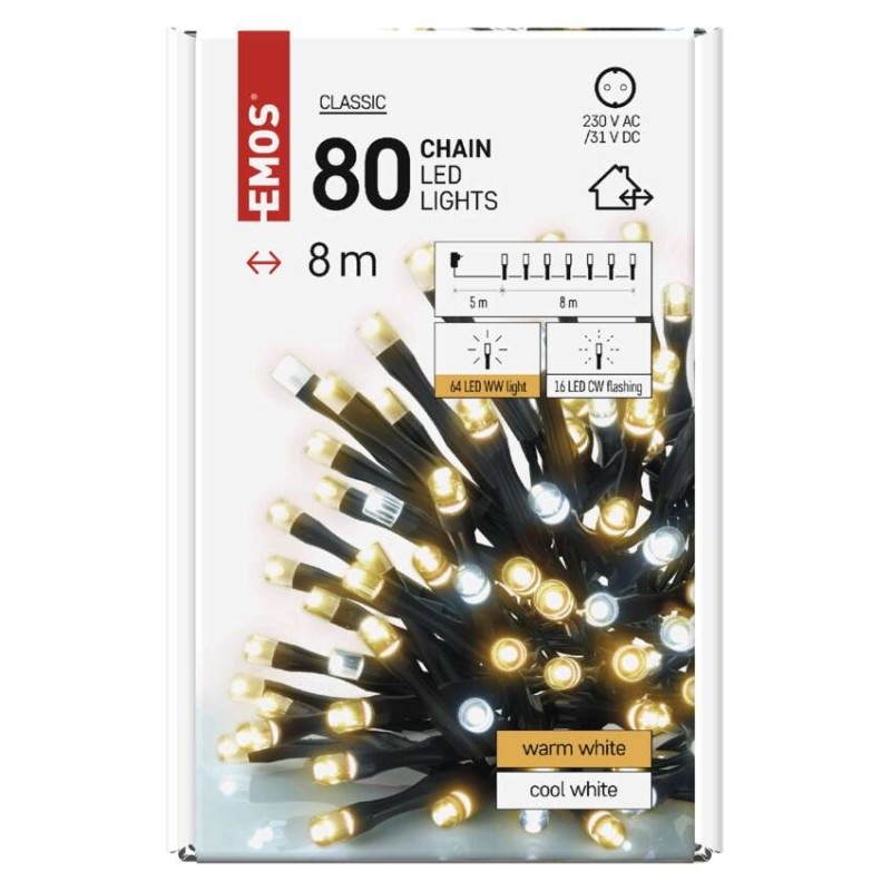 LED řetězy CLASSIC značky EMOS jsou nabízeny v několika tvarových variantách – klasické řetězy, clustery a krápníky. Jsou nepostradatelné pro vytvoření pravé sváteční atmosféry. Skvěle se budou vyjímat na tradičním vánočním stromečku, hodí se k výzdobě nábytku, zábradlí, trámů či dvěří v interiéru. Použít je můžete i v exteriéru, kde rozzáří vaše keře, stromy, pergoly, altánky apod.
