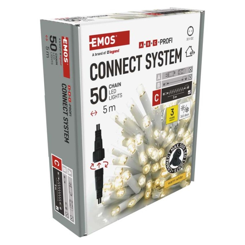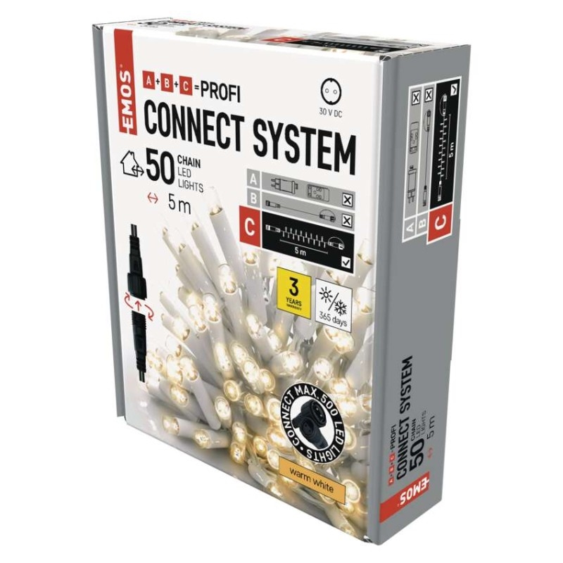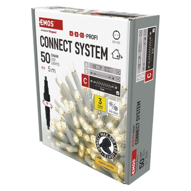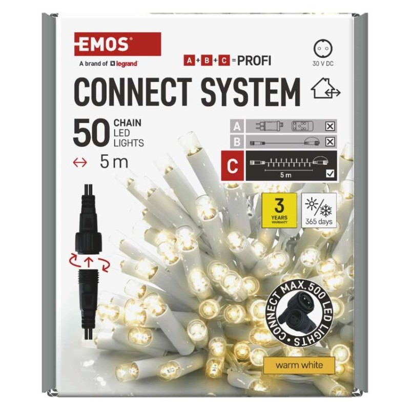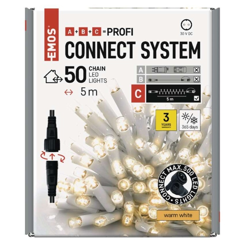 Propojovací systém CONNECT SYSTEM PROFI je díky stupni krytí IP44 vhodný k vnitřnímu i venkovnímu použití. Vyznačuje se zvýšenou odolností materiálu a prodlouženou zárukou 3 let. Vysoce kvalitní gumové kabely umožňují celoroční instalaci bez nutnosti demontáže za jakýchkoliv teplotních podmínek. Vybírat můžete ze standardních řetězů, krápníků a clusterů. Z jediného napájecího zdroje (A) připojeného k prodlužovacím kabelům, rozbočovačům (B) a světelným LED prvkům (C) je možné napájet až 500 LED světýlek.