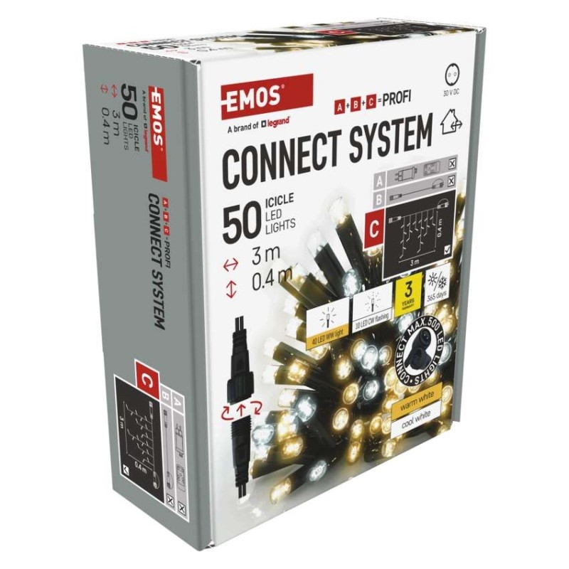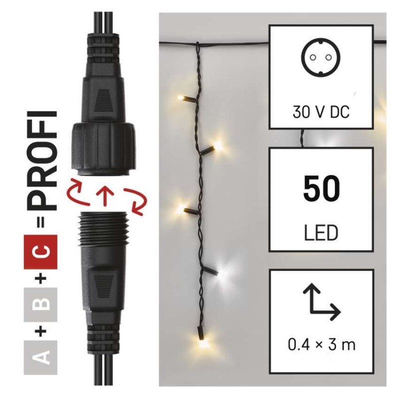 Propojovací systém CONNECT SYSTEM PROFI je díky stupni krytí IP44 vhodný k vnitřnímu i venkovnímu použití. Vyznačuje se zvýšenou odolností materiálu a prodlouženou zárukou 3 let. Vysoce kvalitní gumové kabely umožňují celoroční instalaci bez nutnosti demontáže za jakýchkoliv teplotních podmínek. Vybírat můžete ze standardních řetězů, krápníků a clusterů. Z jediného napájecího zdroje (A) připojeného k prodlužovacím kabelům, rozbočovačům (B) a světelným LED prvkům (C) je možné napájet až 500 LED světýlek.