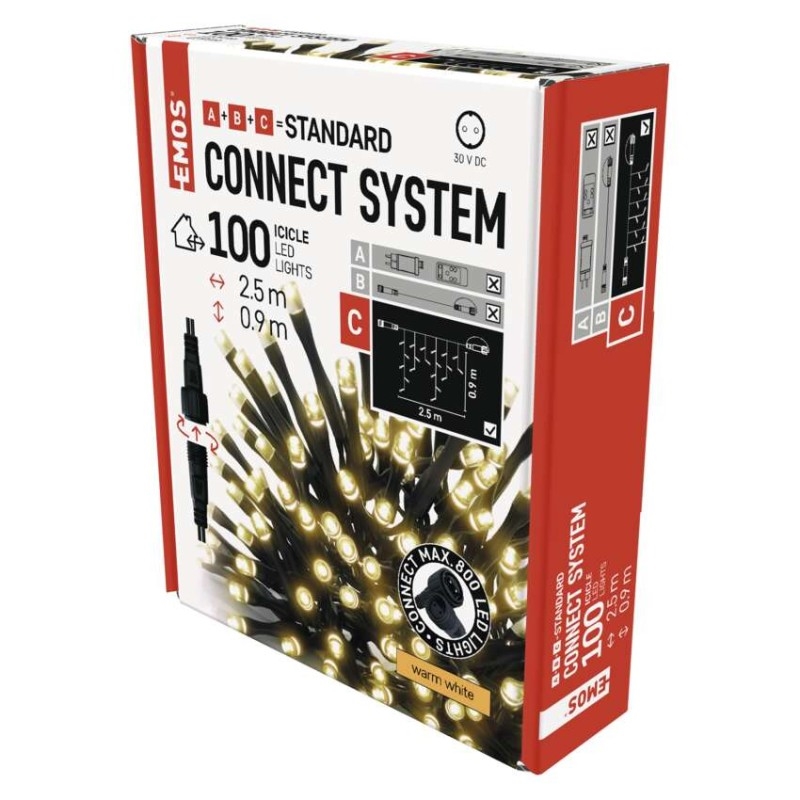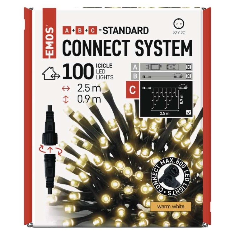 Propojovací systém CONNECT SYSTEM STANDARD je díky stupni krytí IP44 vhodný k vnitřnímu i venkovnímu použití, avšak pouze v sezónu, nikoliv po celý rok. Výhodou tohoto spojovacího systému je široká nabídka LED světelných prvků (C) v několika různých barvách. Ačkoliv je nejpopulárnějším vánočním osvětlením řetěz, ve spojovacím systému můžete vybírat podle vlastních designových preferencí z krápníků, záclon, sítí nebo hvězd na špičku vánočního stromu. Z jediného napájecího zdroje (A) připojeného k prodlužovacím kabelům, rozbočovačům (B) a světelným LED prvkům (C) je možné napájet až 800 LED světýlek.