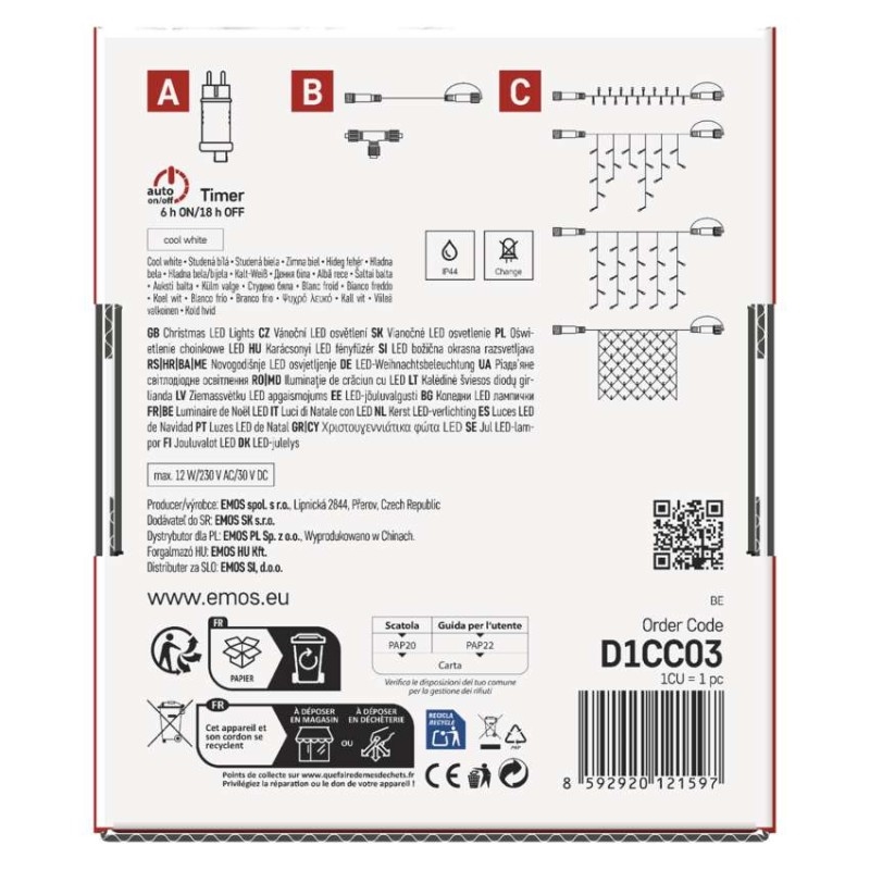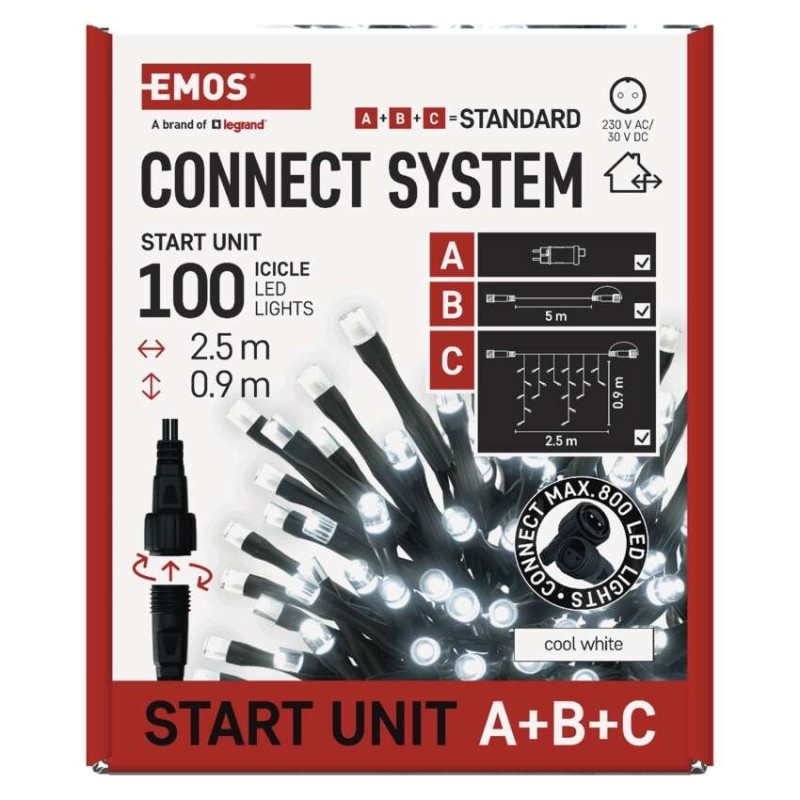 Základní sada systému CONNECT STANDARD obsahuje vše potřebné k tomu, abyste mohli ihned začít s výzdobou vašeho domu, zahrady nebo interiéru. V jednom balení naleznete tři základní komponenty systému nutné pro jeho provoz – napájecí zdroj s časovačem (A), prodlužovací kabel o délce 5 m (B) a vánoční krápníky (rampouchy) o délce 2,5 m se 100 LED diodami (C).