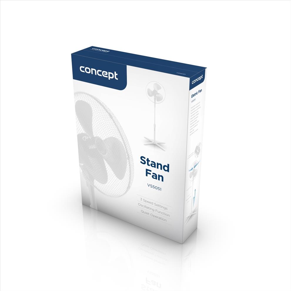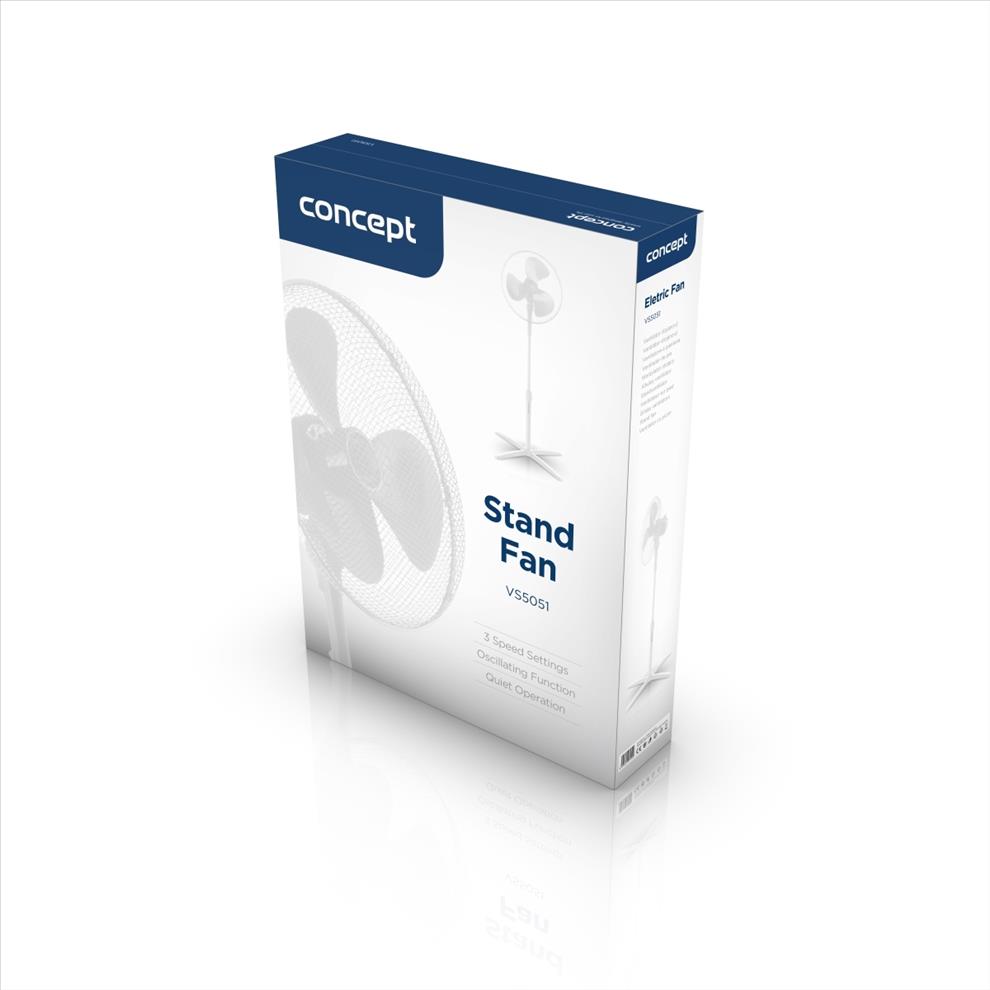 Stojanový letní ventilátor Concept VS5051 nabízí 3 rychlosti, možnost oscilace a nastavitelnou výšku. Je osazen sklopnou vrtulí o průměru 35 cm a vyniká velmi tichým chodem.