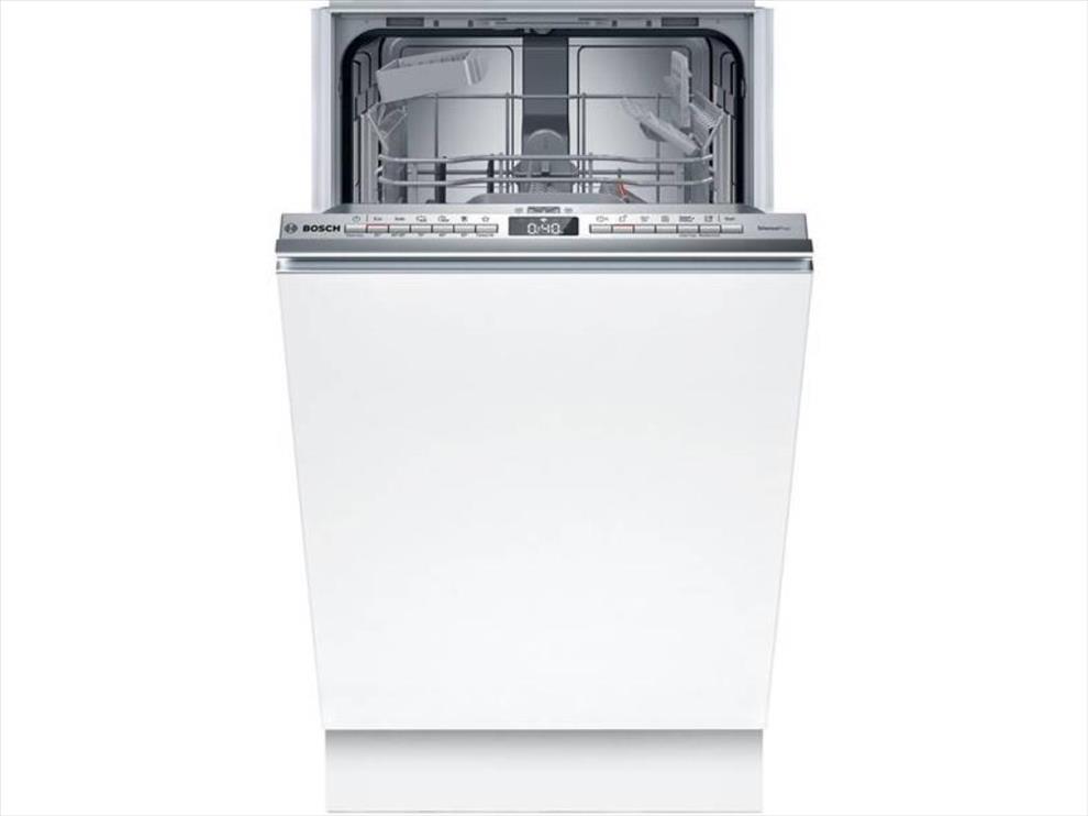 vestavná úzká myčka • plně integrovaný panel • šířka 44,8 cm • 10 sad nádobí • energetická třída B • hlučnost 44 dB • světelný paprsek na podlahu • automatické otevírání dvířek • doživotní záruka AquaStop • 10 let záruky proti prorezavění vnitřního pláště • VarioFlex systém košů • Home Connect • Extra sušení • Intensive Zone s vyšším tlakem ostřiku • hygienicky čisté nádobí • výškově nastavitelný horní koš • zrychlení mytí: SpeedPerfect+ • V × Š × H: 81,5 × 44,8 × 55 cm