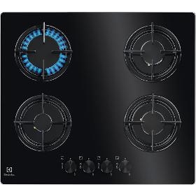 Vestavná varná deska. Typ varné desky: Plyn na skle. Otočné knoflíky. Levá přední: malý hořák, 1000W/54mm. Levá zadní: velký hořák, 2900W/100mm. Pravá přední: střední hořák, 1900W/70mm. Pravá zadní: střední hořák, 1900W/70mm. Integrované elektrické zapalování ovladačem. Bezpečnostní termopojistka. Smaltované podpěry. Souprava pro připojení k plynu. Barva a provedení: Černá