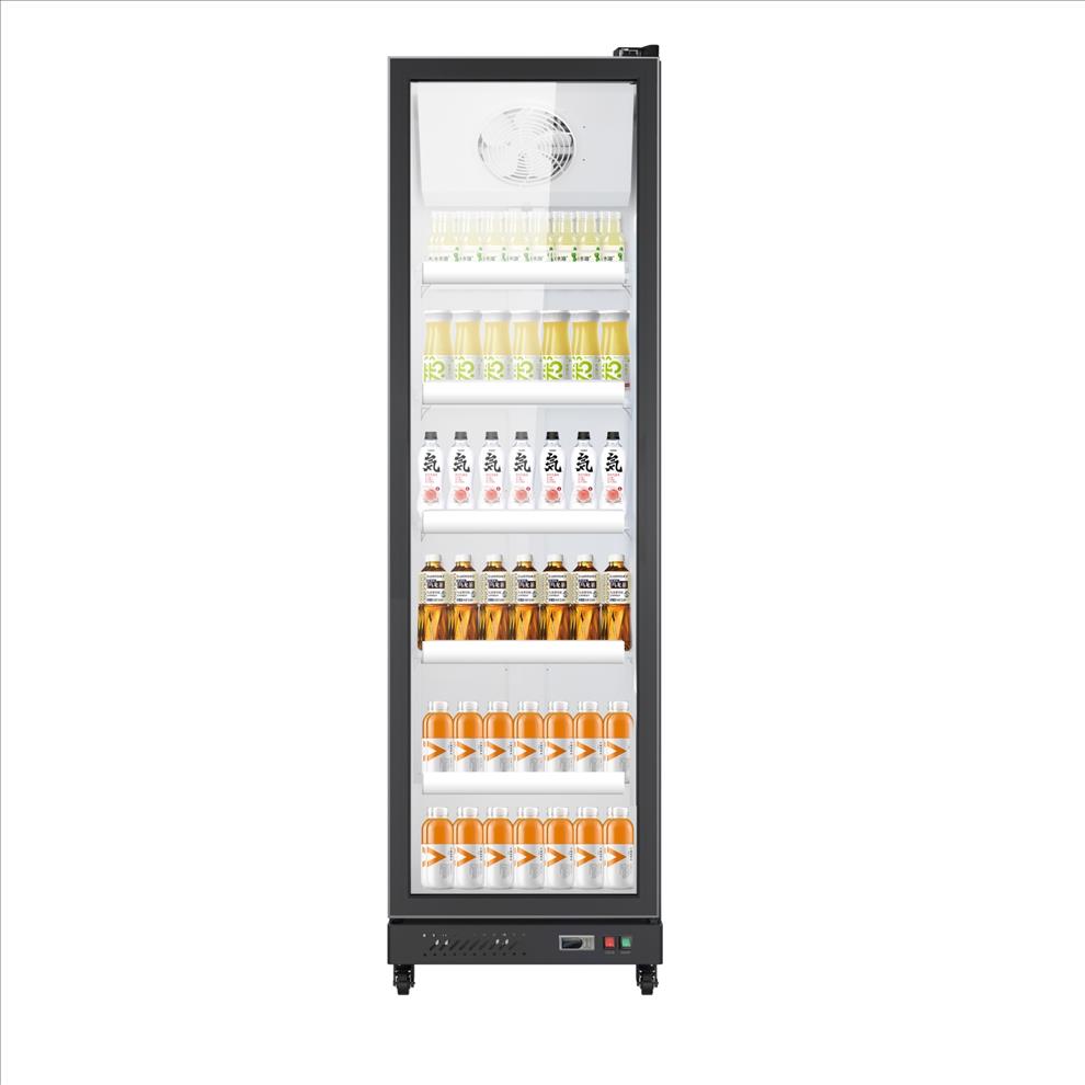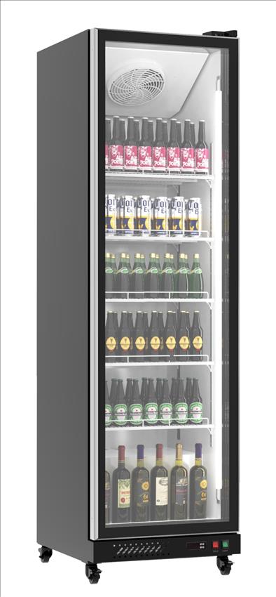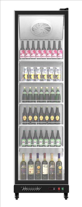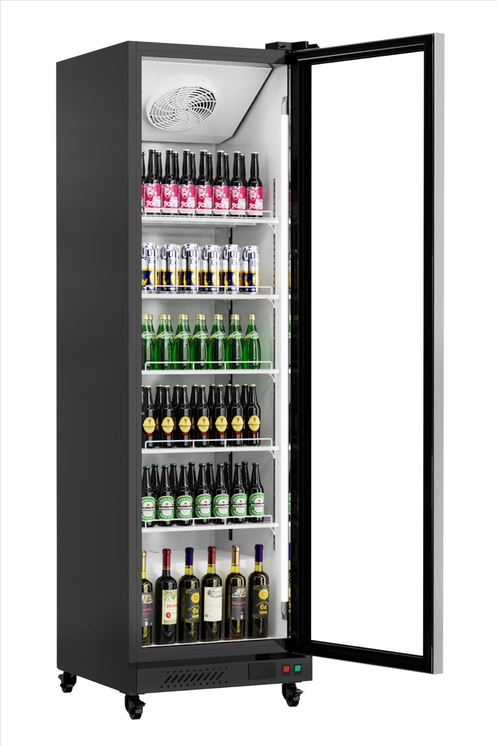 Volně stojící moderní chladící vitrína o objemu 363 l a s 5 drátěnými policemi.