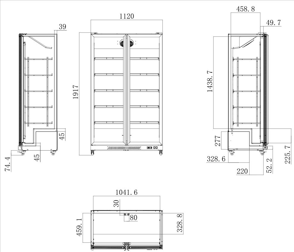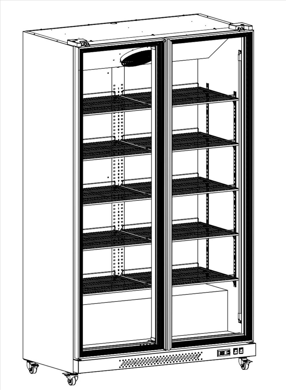 Volně stojící moderní chladící vitrína o objemu 798 l a s 5 drátěnými policemi.