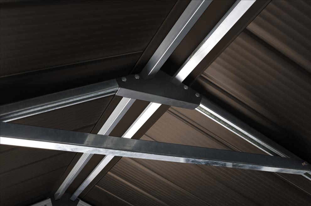 Konstrukce zahradního domku G21 se skládá z pozinkovaného plechu, plastových sloupků o síle materiálu 1,5 mm a vnějších panelů o síle 12 mm. Panely jsou vyrobeny ze