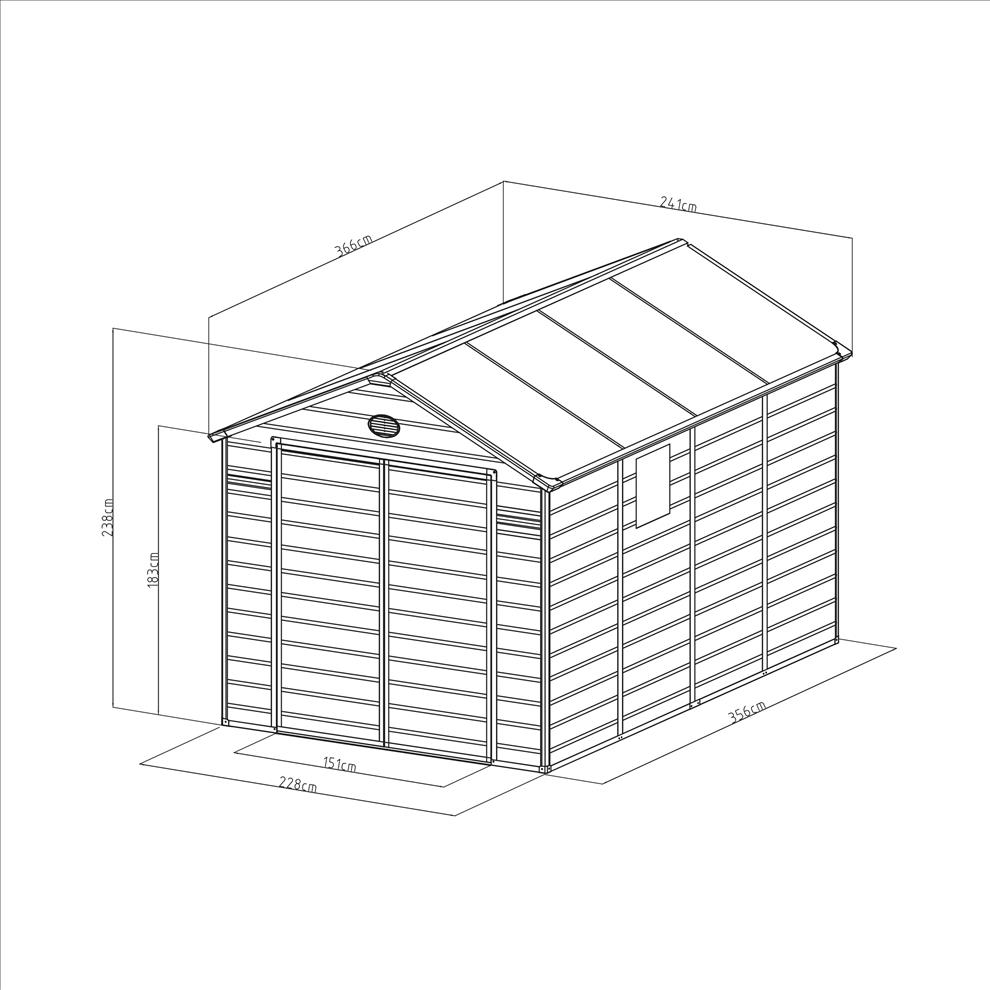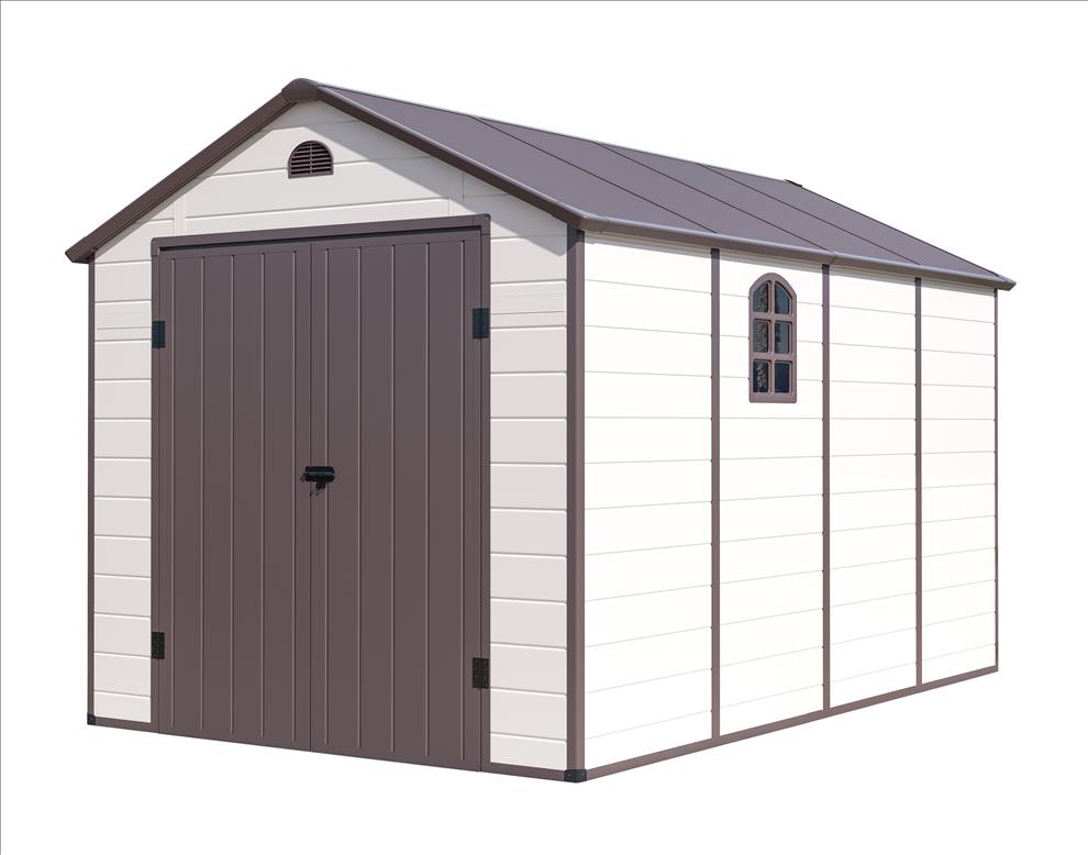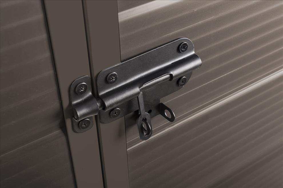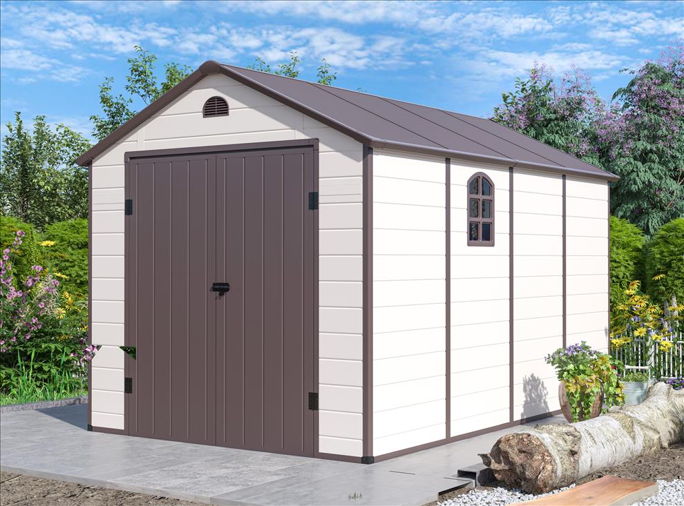 sendvičového tvrzeného plastu. Střecha zahradního domku je zkonstruována tak, aby vydržela zatížení až 60 kg/m2. Na přední straně domku jsou umístěny dvoukřídlé dveře o šířce 151 cm a výšce 183 cm, které zajišťují snadný přístup.