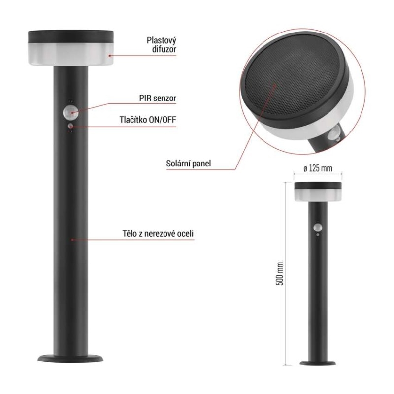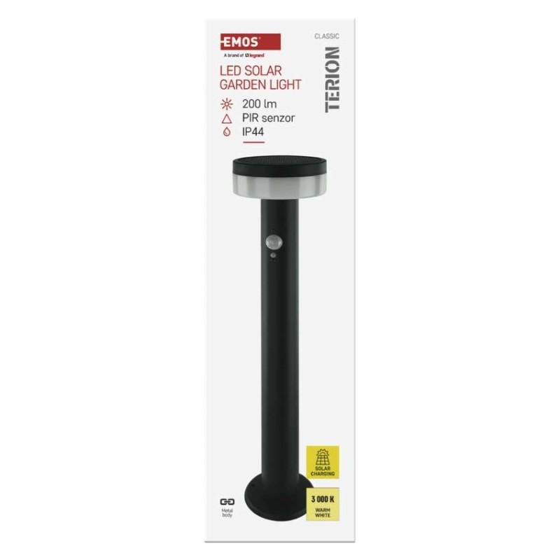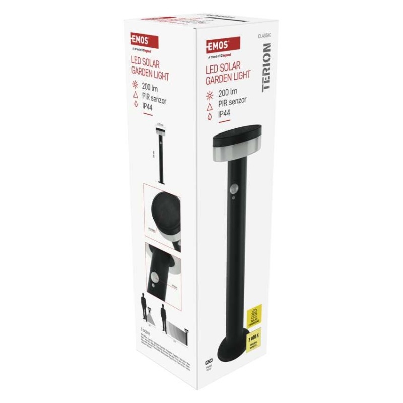 barva: antracit|barva světla: teplá bílá|dosah PIR senzoru: 10 m|energetická třída použitého světelného zdroje: –|fotovoltaický článek: 0,88 W|frekvence: –|index podání barev (CRI): > 80|kategorie: CLASSIC|krytí: IP44|materiál: nerezová ocel|materiál difuzoru: plast|napájení: Li-Ion akumulátor 3,7 V/1 200 mAh|napětí: –|patice (uchycení žárovky): –|PIR senzor: ano|příkon: 2 W|prodejní obal: 1 ks, krabička|řada: TERION|rozměr: 125 × 125 × 500 mm|rozsah pracovní teploty: 0 ~ +40 °C|soumrakový spínač: ano|světelný tok: max. 200 lm|teplota chromatičnosti: 3000 K|vestavěný vypínač: ano|žárovka součástí balení: –|zdroj světla: LED|životnost: 25 000 h