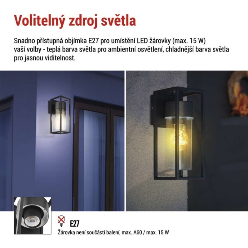 barva: černá|barva světla: –|dosah PIR senzoru: –|energetická třída použitého světelného zdroje: –|fotovoltaický článek: ne|frekvence: 50/60 Hz|index podání barev (CRI): –|kategorie: CLASSIC|krytí: IP44|materiál: hliník|materiál difuzoru: plast|napájení: 230 V AC|napětí: 220-240 V~|patice (uchycení žárovky): E27|PIR senzor: ne|příkon: –|prodejní obal: 1 ks, krabička|řada: TILLIA|rozměr: 128 × 110 × 270 mm|rozsah pracovní teploty: -20 ~ +40 °C|soumrakový spínač: ne|světelný tok: –|teplota chromatičnosti: –|vestavěný vypínač: ne|žárovka součástí balení: ne|zdroj světla: –|životnost: –