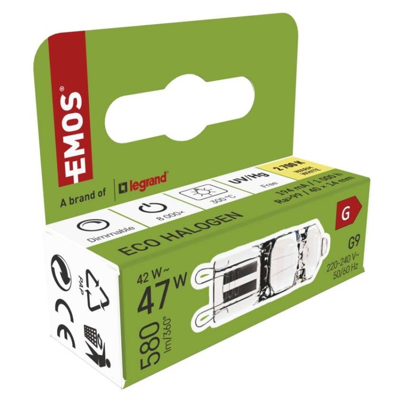 barva světla: teplá bílá|energetická třída: G|frekvence: 50/60 Hz|index podání barev (CRI): 99,9|kompatibilita: –|náhrada za žárovku: 47 W|napětí: 220-240 V~|notifikace do mobilní aplikace: –|ovládání hlasovými asistenty: –|patice (uchycení žárovky): G9|počet čipů: –|počet spínacích cyklů: 8 000|podporované OS: –|přenosová frekvence: –|příkon: 42 W|prodejní obal: 1 ks, krabička|protokol: –|řada: HALOGEN|rozměr: 40 × 14 × 14 mm|stmívatelná: ano|světelná účinnost: 13 lm/W|světelný tok: 580 lm|technologie: halogen|teplota chromatičnosti: 2 700 K|tvar: JC|typ čipů: –|účiník: –|úhel vyzařování: 270°|záruční doba: –|životnost: 1 000 hodin