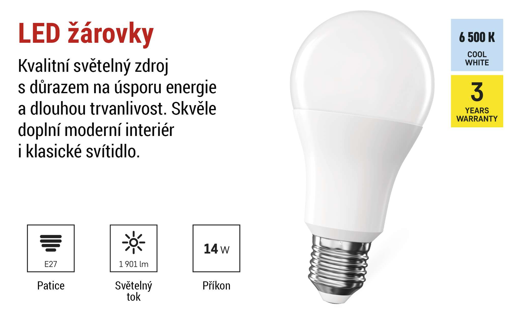 barva světla: studená bílá|energetická třída: D|frekvence: 50/60 Hz|index podání barev (CRI): 80|kompatibilita: –|náhrada za žárovku: 120 W|napětí: 220-240 V~|notifikace do mobilní aplikace: –|ovládání hlasovými asistenty: –|patice (uchycení žárovky): E27|počet čipů: –|počet spínacích cyklů: 30 000|podporované OS: –|přenosová frekvence: –|příkon: 14 W|prodejní obal: 1 ks, krabička|protokol: –|řada: CLASSIC|rozměr: 60 × 60 × 120 mm|stmívatelná: ne|světelná účinnost: 136 lm/W|světelný tok: 1 901 lm|technologie: LED|teplota chromatičnosti: 6 500 K|tvar: Classic A60|typ čipů: SMD|účiník: 0,59|úhel vyzařování: 180°|záruční doba: 3 roky|životnost: 30 000 hodin