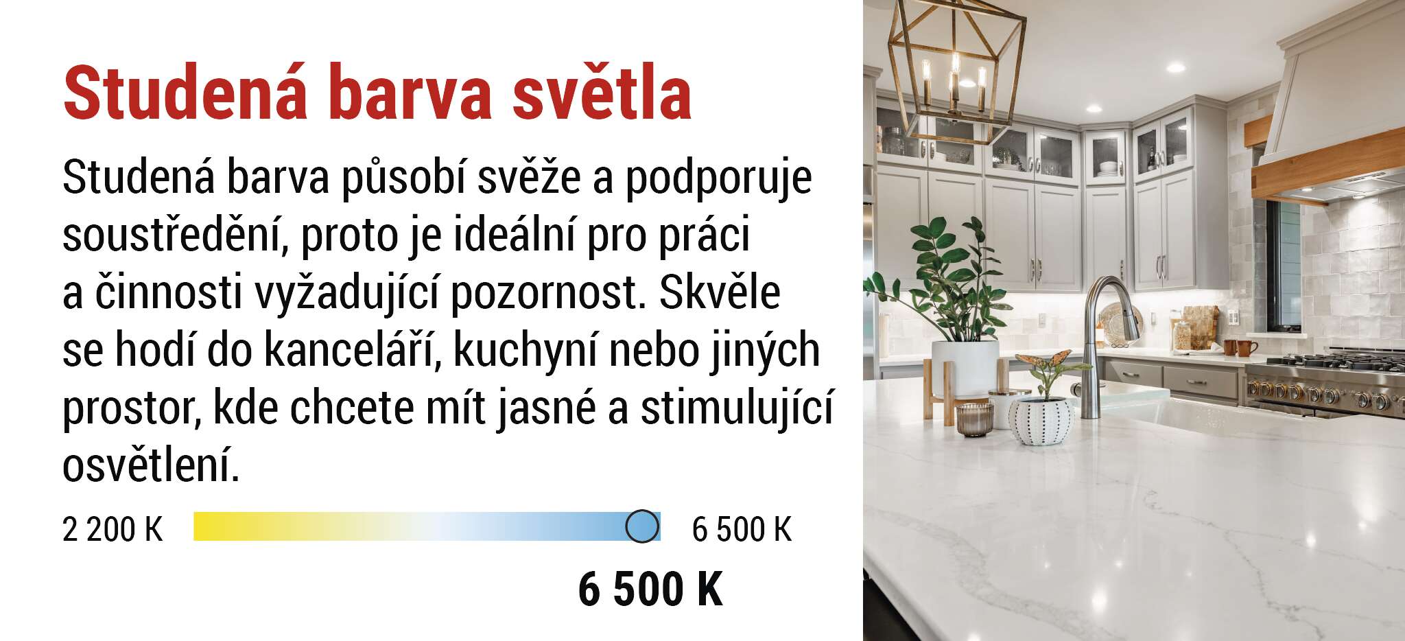 Studená barva světla poskytuje velmi jasné a čisté osvětlení, které podporuje soustředění a přesnost. Díky svému chladnějšímu odstínu zajišťuje výbornou viditelnost detailů a je ideální pro pracovní a technické prostory.