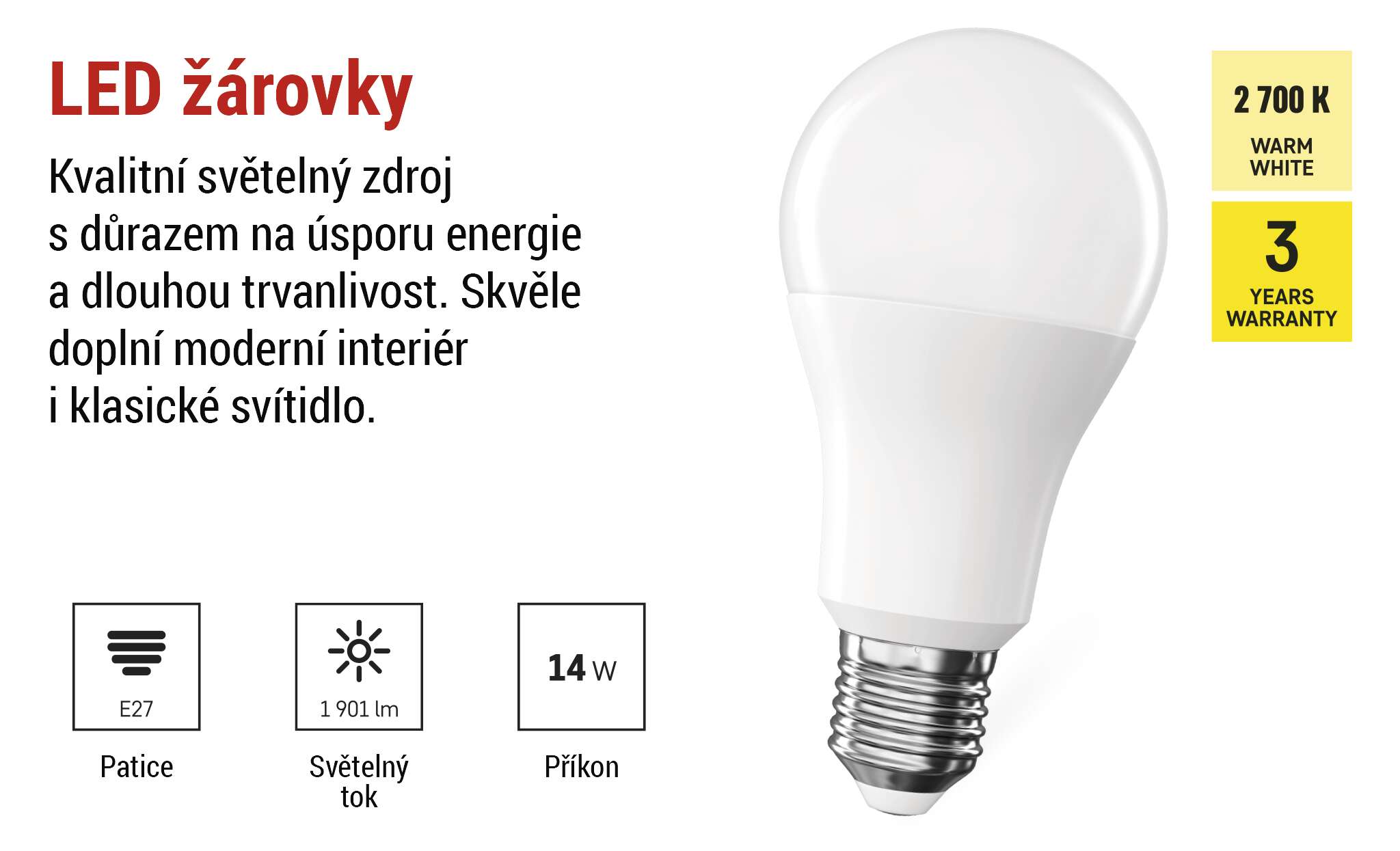 barva světla: teplá bílá|energetická třída: D|frekvence: 50/60 Hz|index podání barev (CRI): 80|kompatibilita: –|náhrada za žárovku: 120 W|napětí: 220-240 V~|notifikace do mobilní aplikace: –|ovládání hlasovými asistenty: –|patice (uchycení žárovky): E27|počet čipů: –|počet spínacích cyklů: 30 000|podporované OS: –|přenosová frekvence: –|příkon: 14 W|prodejní obal: 1 ks, krabička|protokol: –|řada: CLASSIC|rozměr: 60 × 60 × 120 mm|stmívatelná: ne|světelná účinnost: 136 lm/W|světelný tok: 1 901 lm|technologie: LED|teplota chromatičnosti: 2 700 K|tvar: Classic A60|typ čipů: SMD|účiník: 0,59|úhel vyzařování: 180°|záruční doba: 3 roky|životnost: 30 000 hodin