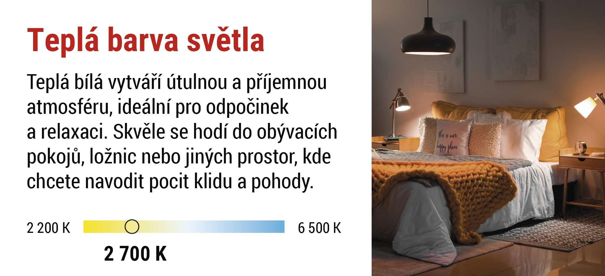 Teplá barva světla vytváří útulné a harmonické prostředí, ve kterém se budete cítit přirozeně a uvolněně. Světlo s teplým odstínem se podobá klasickému žárovkovému osvětlení a je ideální pro večerní relaxaci i každodenní pohodu.