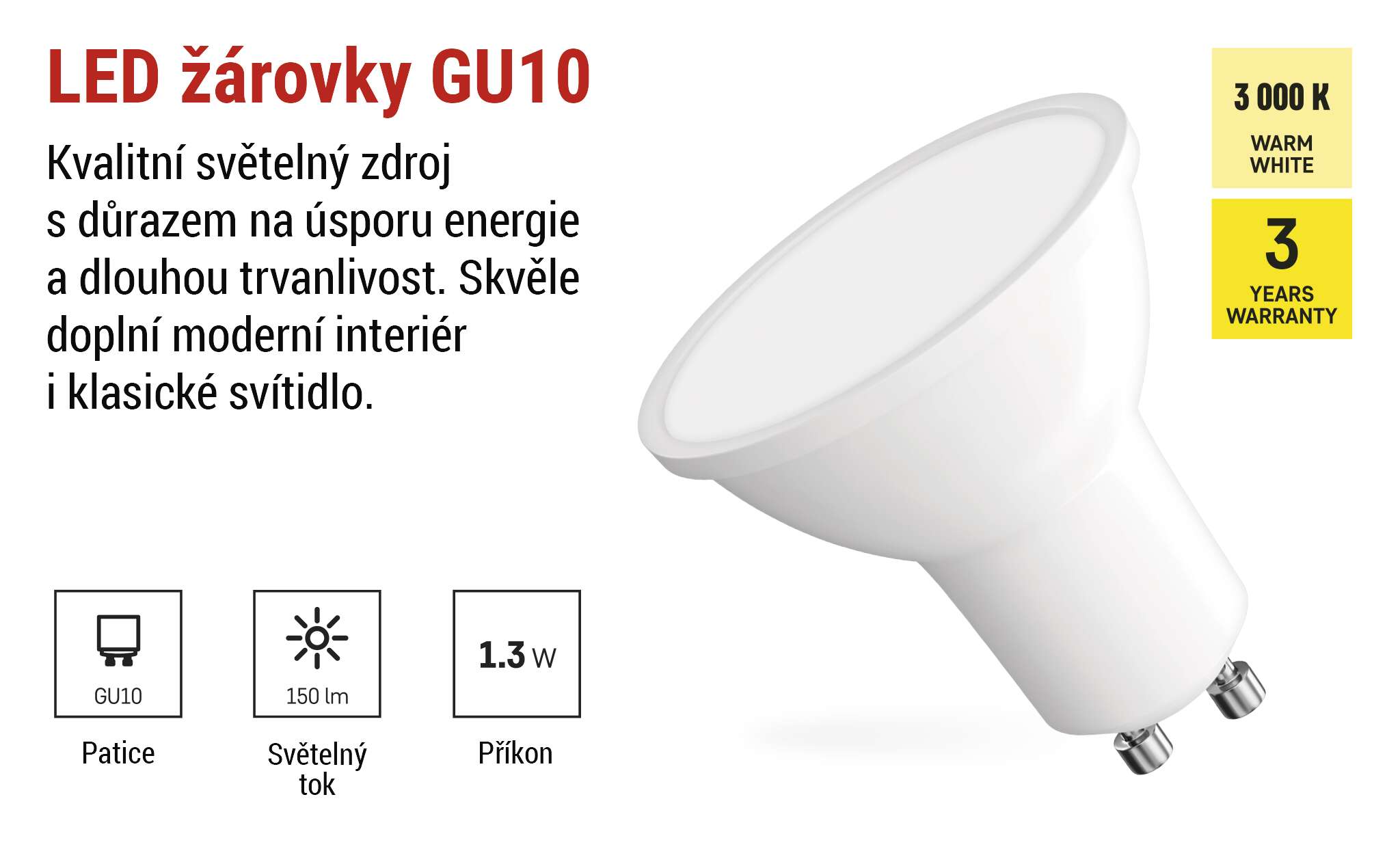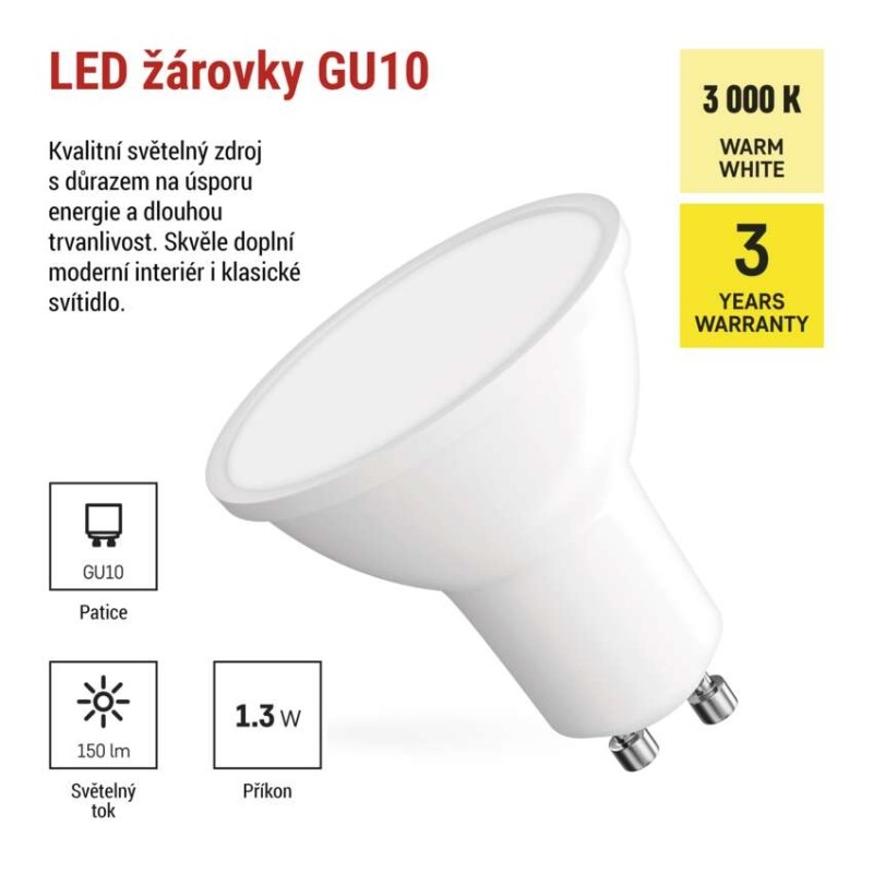barva světla: teplá bílá|energetická třída: E|frekvence: 50/60 Hz|index podání barev (CRI): 80|kompatibilita: –|náhrada za žárovku: 16 W|napětí: 220-240 V~|notifikace do mobilní aplikace: –|ovládání hlasovými asistenty: –|patice (uchycení žárovky): GU10|počet čipů: –|počet spínacích cyklů: 30 000|podporované OS: –|přenosová frekvence: –|příkon: 1,3 W|prodejní obal: 1 ks, krabička|protokol: –|řada: CLASSIC|rozměr: 50 × 50 × 58 mm|stmívatelná: ne|světelná účinnost: 115 lm/W|světelný tok: 150 lm|technologie: LED|teplota chromatičnosti: 3 000 K|tvar: MR16|typ čipů: SMD|účiník: 0,40|úhel vyzařování: 100°|záruční doba: 3 roky|životnost: 30 000 hodin
