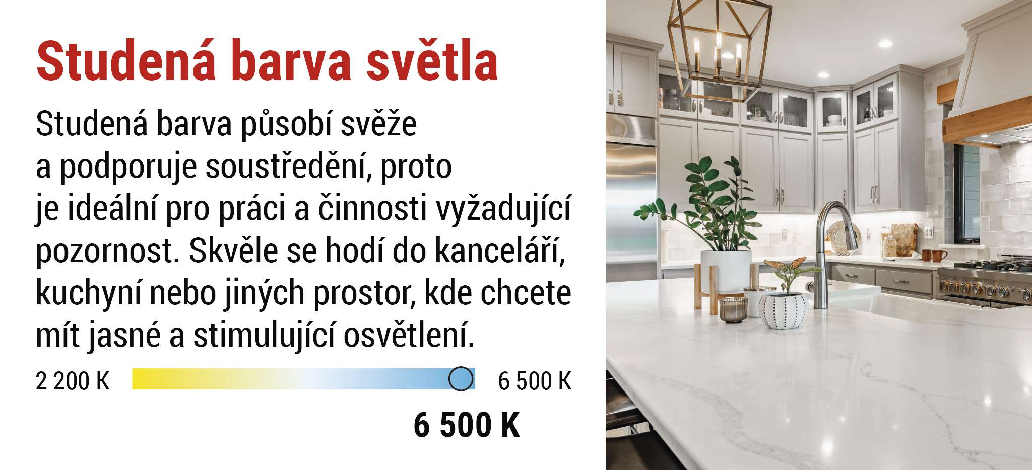 Studená barva světla poskytuje velmi jasné a čisté osvětlení, které podporuje soustředění a přesnost. Díky svému chladnějšímu odstínu zajišťuje výbornou viditelnost detailů a je ideální pro pracovní a technické prostory.