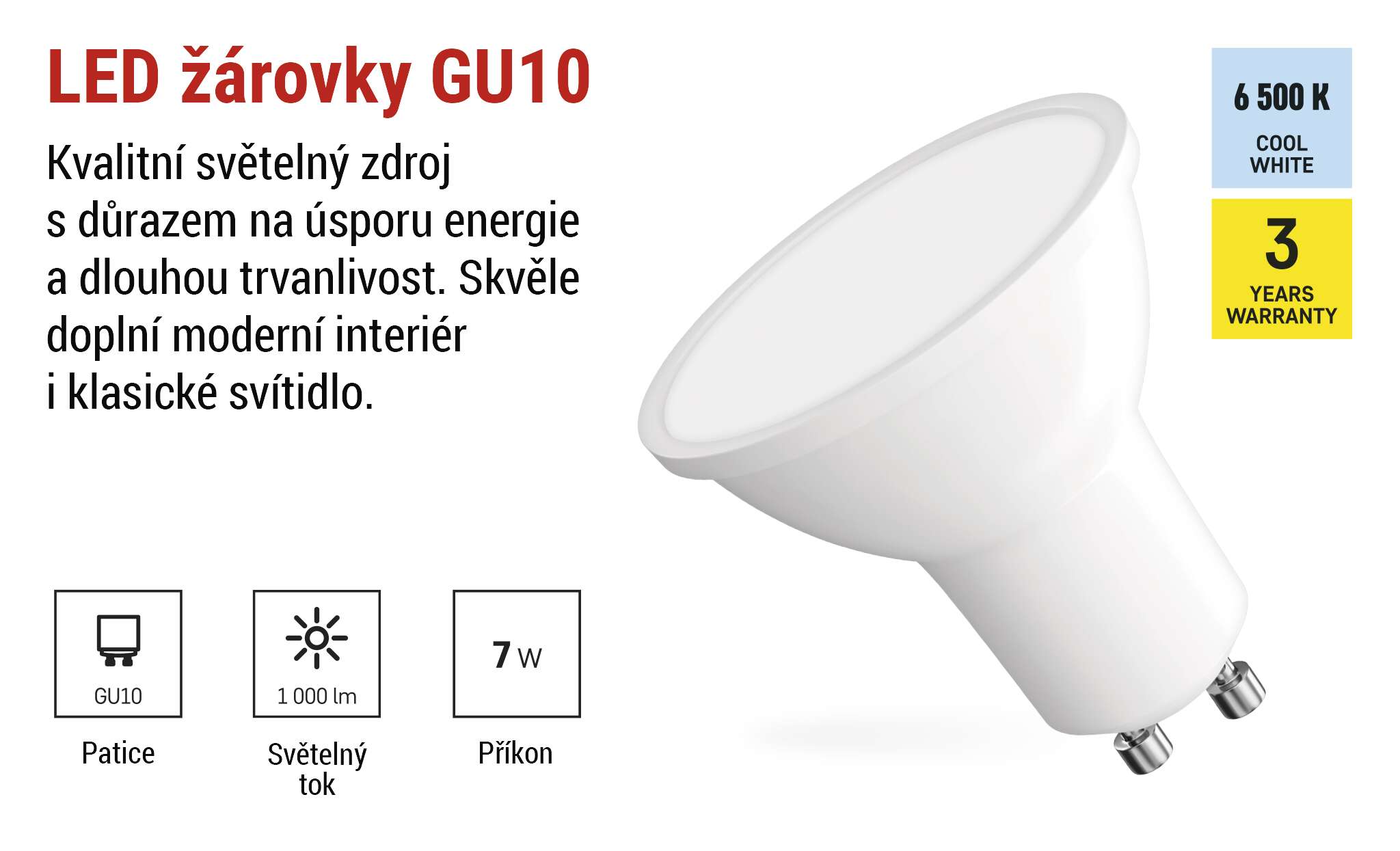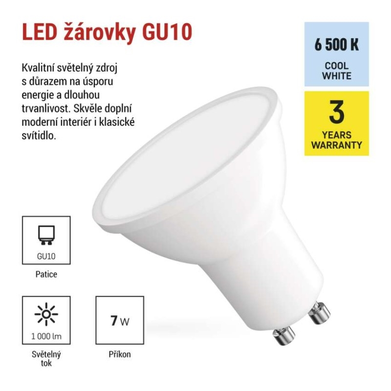 barva světla: studená bílá|energetická třída: D|frekvence: 50/60 Hz|index podání barev (CRI): 80|kompatibilita: –|náhrada za žárovku: 72 W|napětí: 220-240 V~|notifikace do mobilní aplikace: –|ovládání hlasovými asistenty: –|patice (uchycení žárovky): GU10|počet čipů: –|počet spínacích cyklů: 30 000|podporované OS: –|přenosová frekvence: –|příkon: 7 W|prodejní obal: 1 ks, krabička|protokol: –|řada: CLASSIC|rozměr: 50 × 50 × 58 mm|stmívatelná: ne|světelná účinnost: 143 lm/W|světelný tok: 1 000 lm|technologie: LED|teplota chromatičnosti: 6 500 K|tvar: MR16|typ čipů: SMD|účiník: 0,50|úhel vyzařování: 100°|záruční doba: 3 roky|životnost: 30 000 hodin