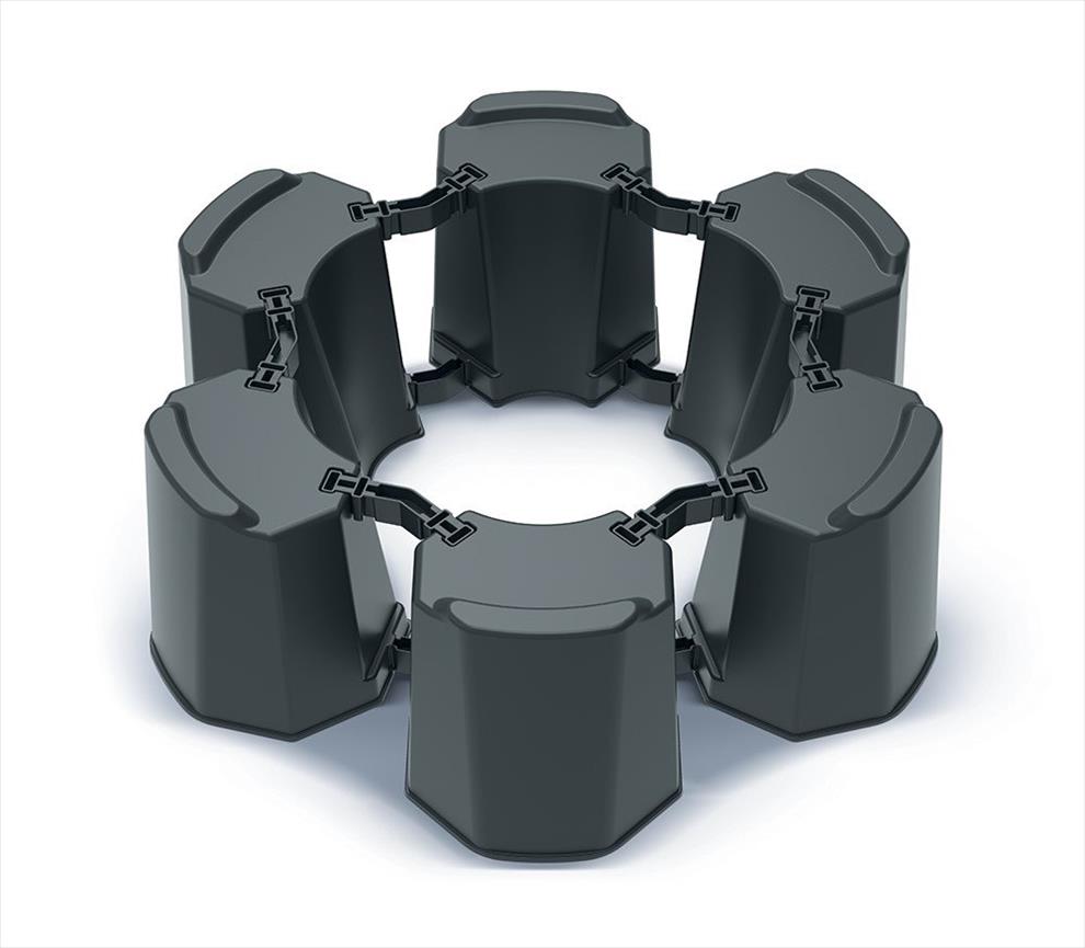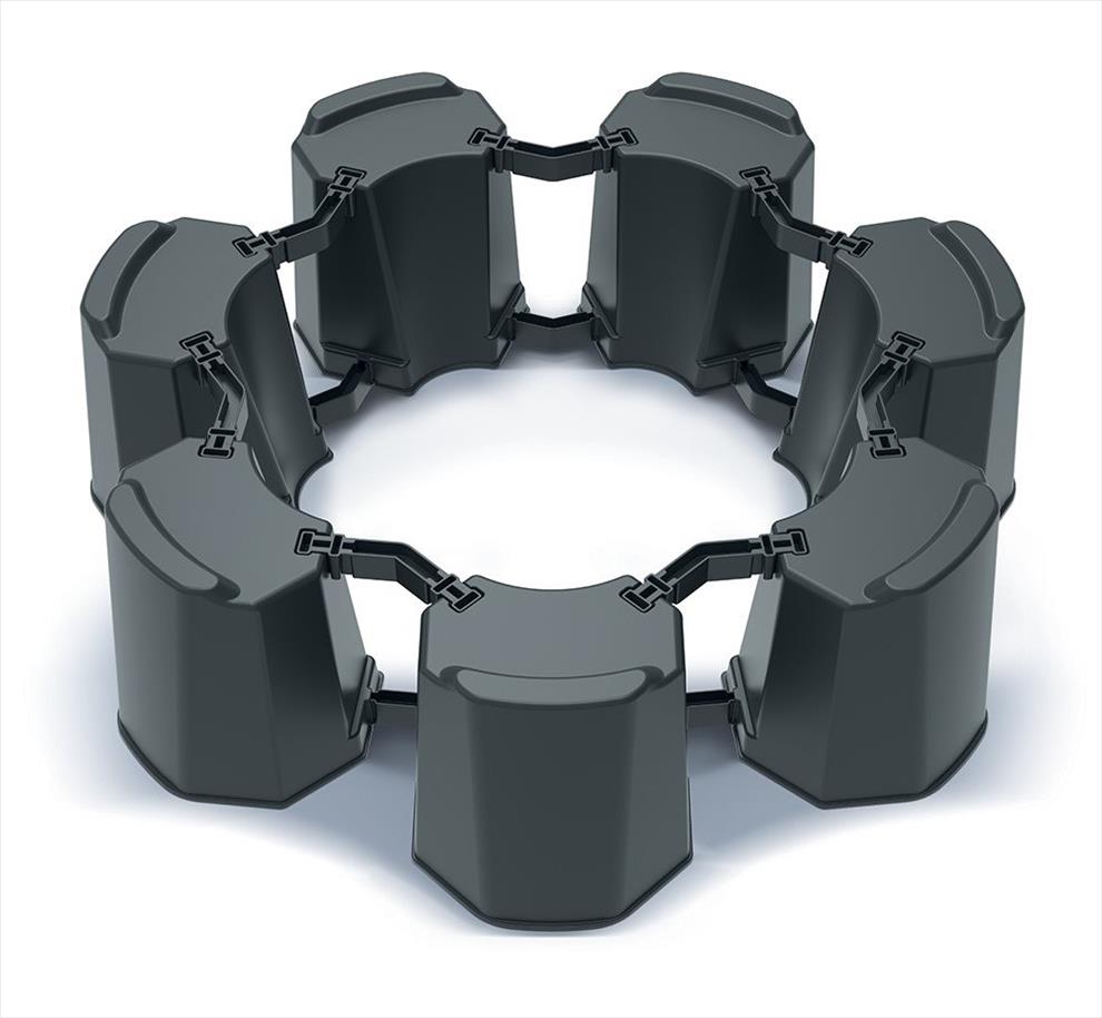 Sada MODULAR BASECAN SET umožňuje vytvořit podstavec podle velikosti nádrže na dešťovou vodu. Pro podstavec o průměru 470 až 556 mm se používá 6 modulů a 12 spojovacích prvků typu E. Pro větší variantu o průměru 600 až 673 mm se využívá 7 modulů a 14 spojovacích prvků typu F.