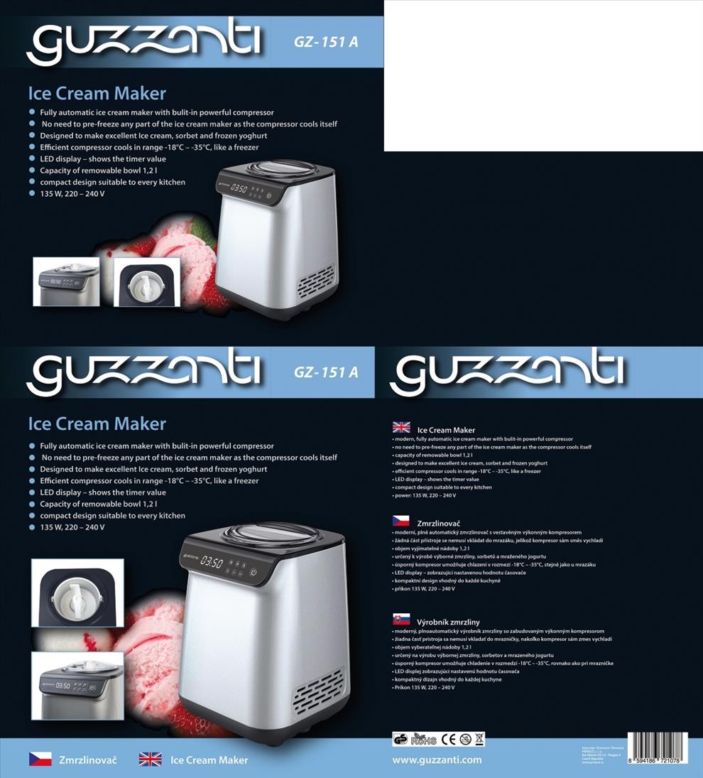 Vynikající krémovou zmrzlinu, sorbety a mražené jogurty vám zajistí Guzzanti GZ 151A. Navíc je tento model vybaven kompresorem, takže se přístroj nemusí vkládat do mrazáku.